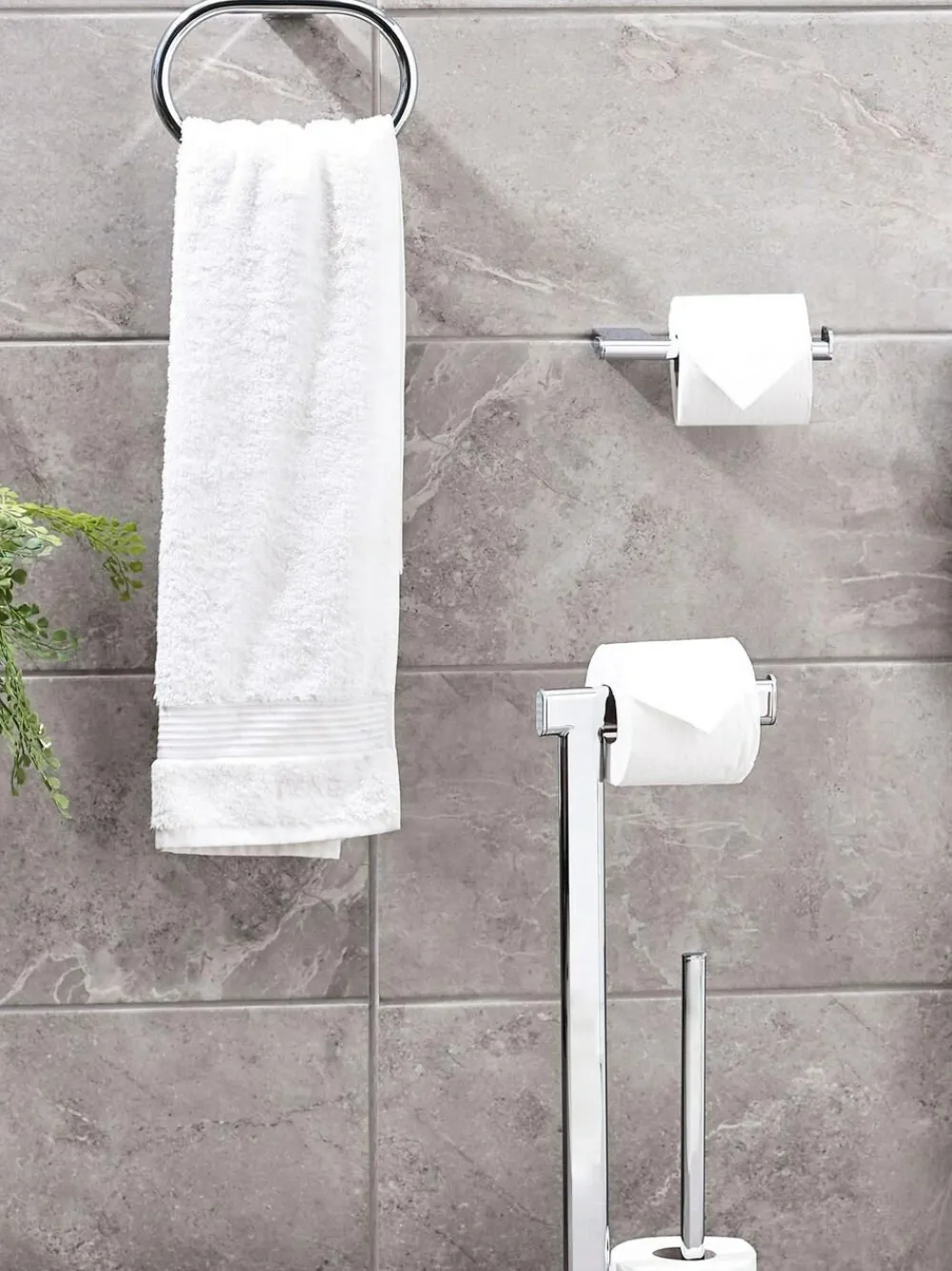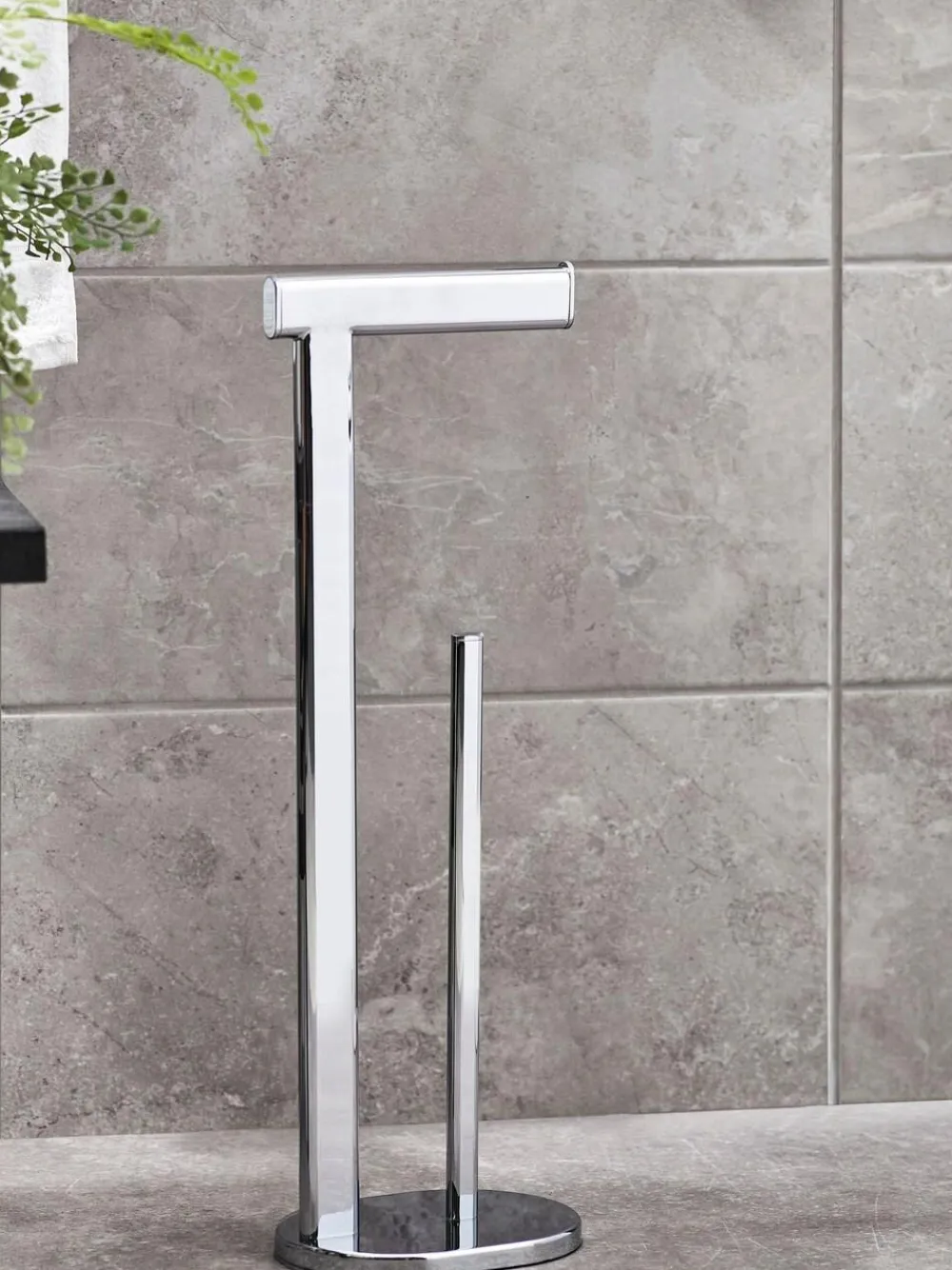 Our Oslo bathroom fittings range is designed to provide a contemporary sleek look to your bathroom. In chrome our freestanding Oslo toilet roll holder is the perfect storage solution. Toilet roll holder Floor standing Chrome finish Height 53cm Width 18cm Depth 13cm 95% Iron, 5% EVA. This item has been tested to ensure it is bathroom suitable and protects against corrosion and distortion from steam.