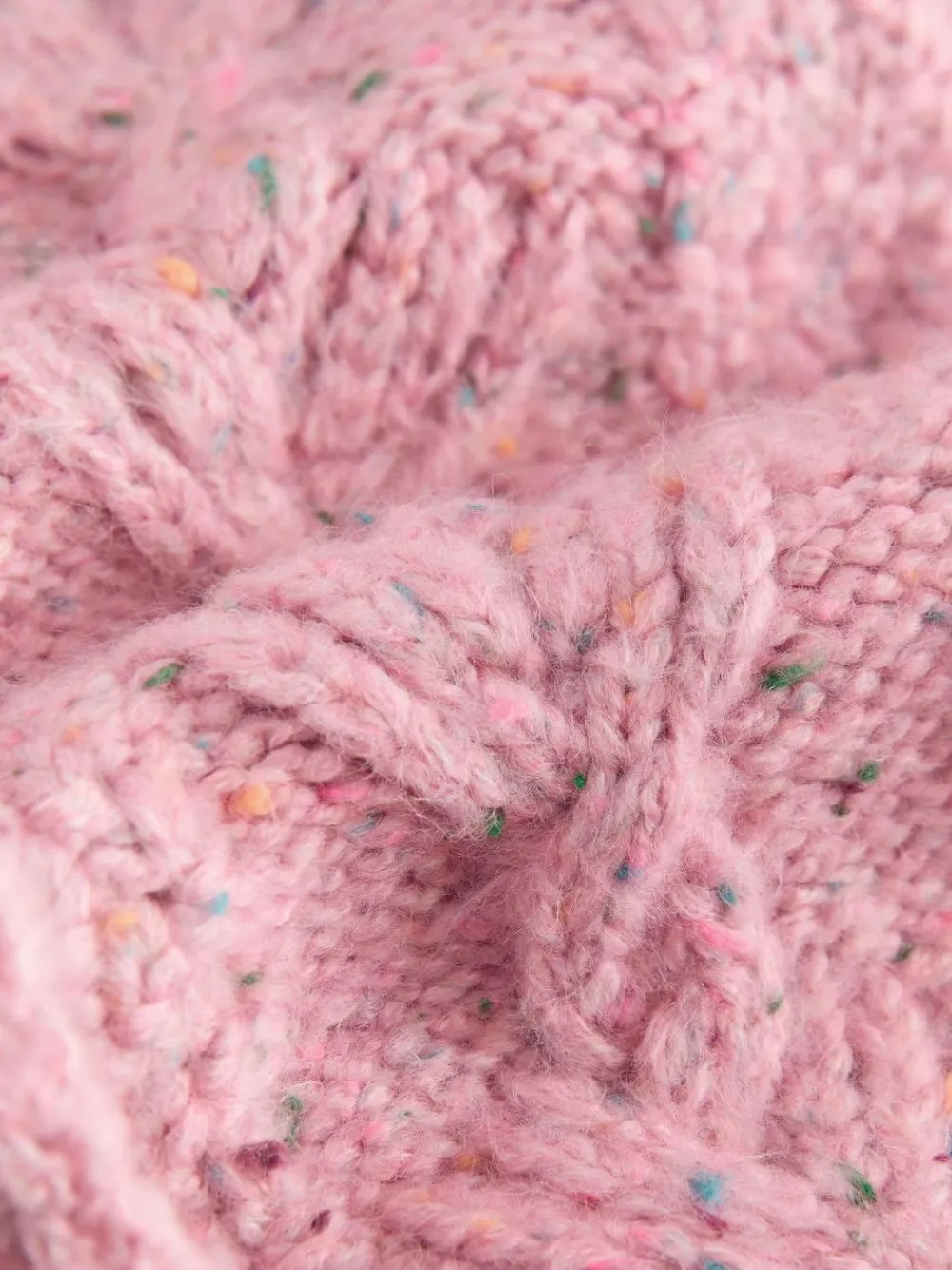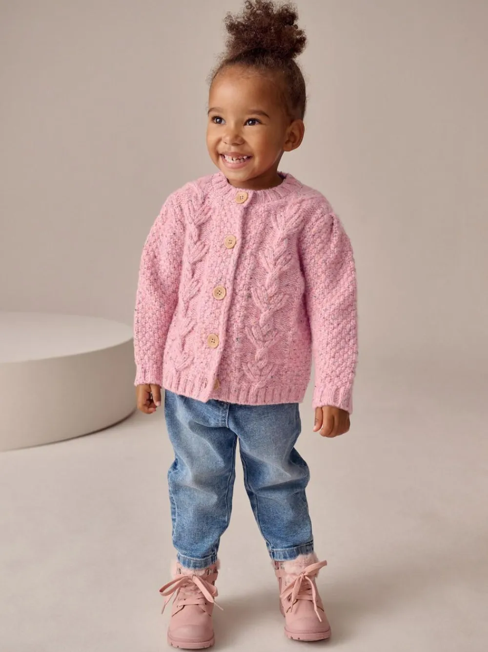 Keep your little one warm in this pink Chunky Knit Bobble Cardigan. This is a cosy and cute layer, perfect for adding warmth to any outfit. It features a classic round neck and is knitted with a chunky, textured design that includes intricate bobble and cable knit details. The long sleeves and regular fit ensure comfort, while the contrasting brown button front fastening makes for easy dressing. Button front fastening Round neck Long sleeve Regular fit 75% Recycled polyester, 25% Acrylic.