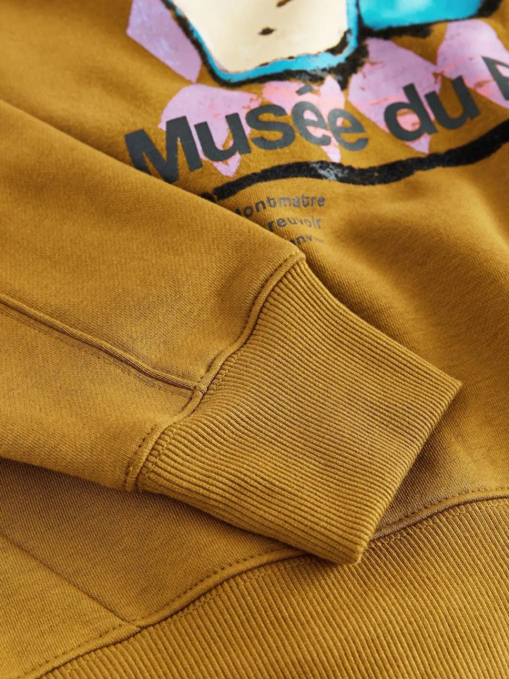 Make a statement with this art-inspired sweatshirt in olive green. The cotton-rich fabric offers a comfortable feel, while the eye-catching fruit graphic and bold text create a modern look. A perfect choice for adding a touch of creative flair to your casual wardrobe. Cotton-rich Fruit art graphic Crew neck Long sleeves Ribbed cuffs and hem Machine washable. 70% Cotton, 30% Recycled polyester.
