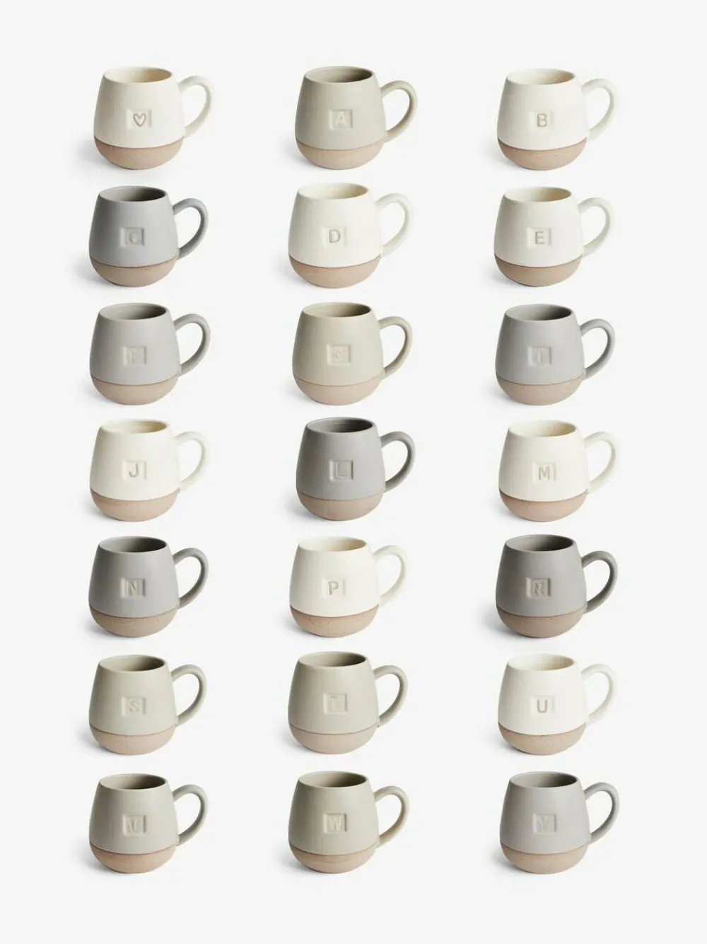 Beautifully designed, these alphabet mugs come in a variety of soft natural shades in a soft, hug mug shape. Featuring a subtle speckle with an on-trend, dipped effect glaze, these mugs would make a perfect self-purchase or gift, just choose your letter! Made from durable stoneware, the letter on the design is carefully crafted using a wax resist technique, giving it that artisan feeling. Letters B, E, H, J, P, and heart symbol are available in off-white. Letters A, G, K, O, S, T, W and & symbol are available in light grey. Letters C, F, I, L, N, R and V are available in mid grey. Height 10cm D/Wash and M/W safe. 100% Stoneware. Dishwasher safe, microwaveable. Dishwasher Safe , Microwavable