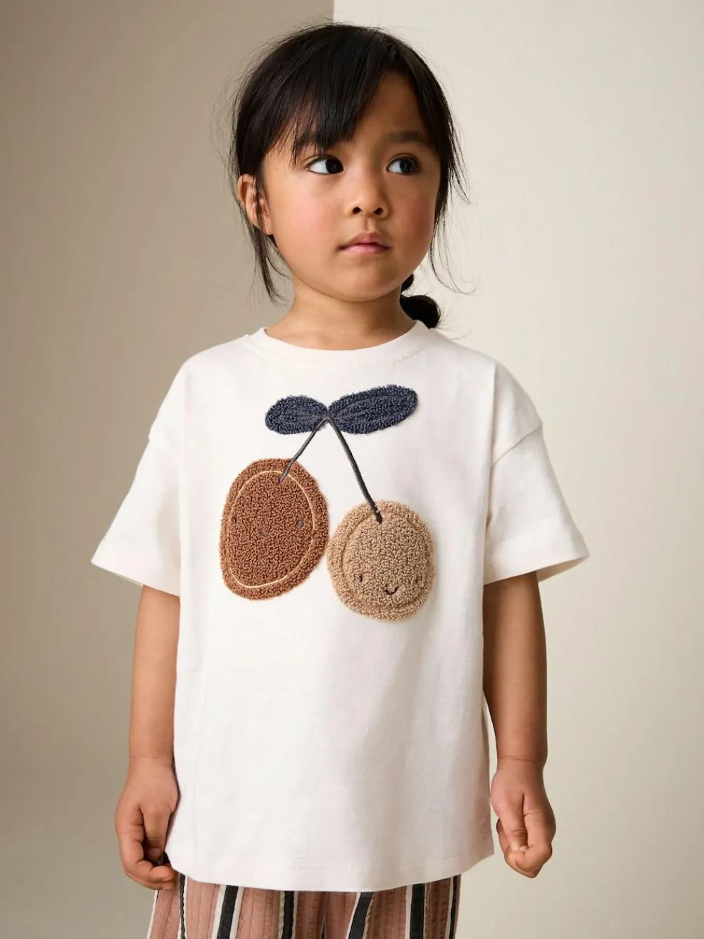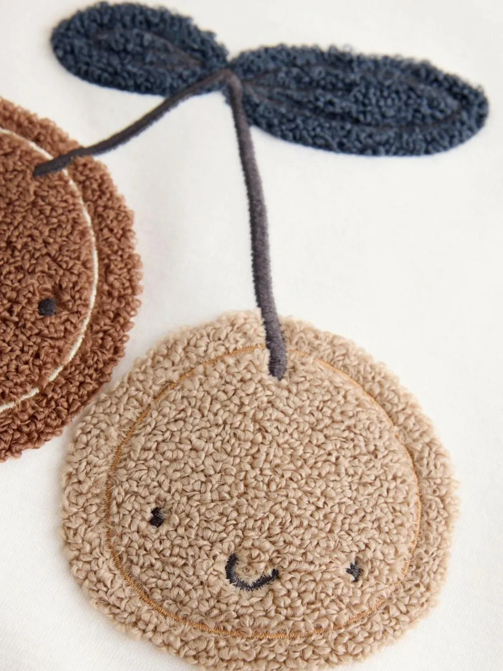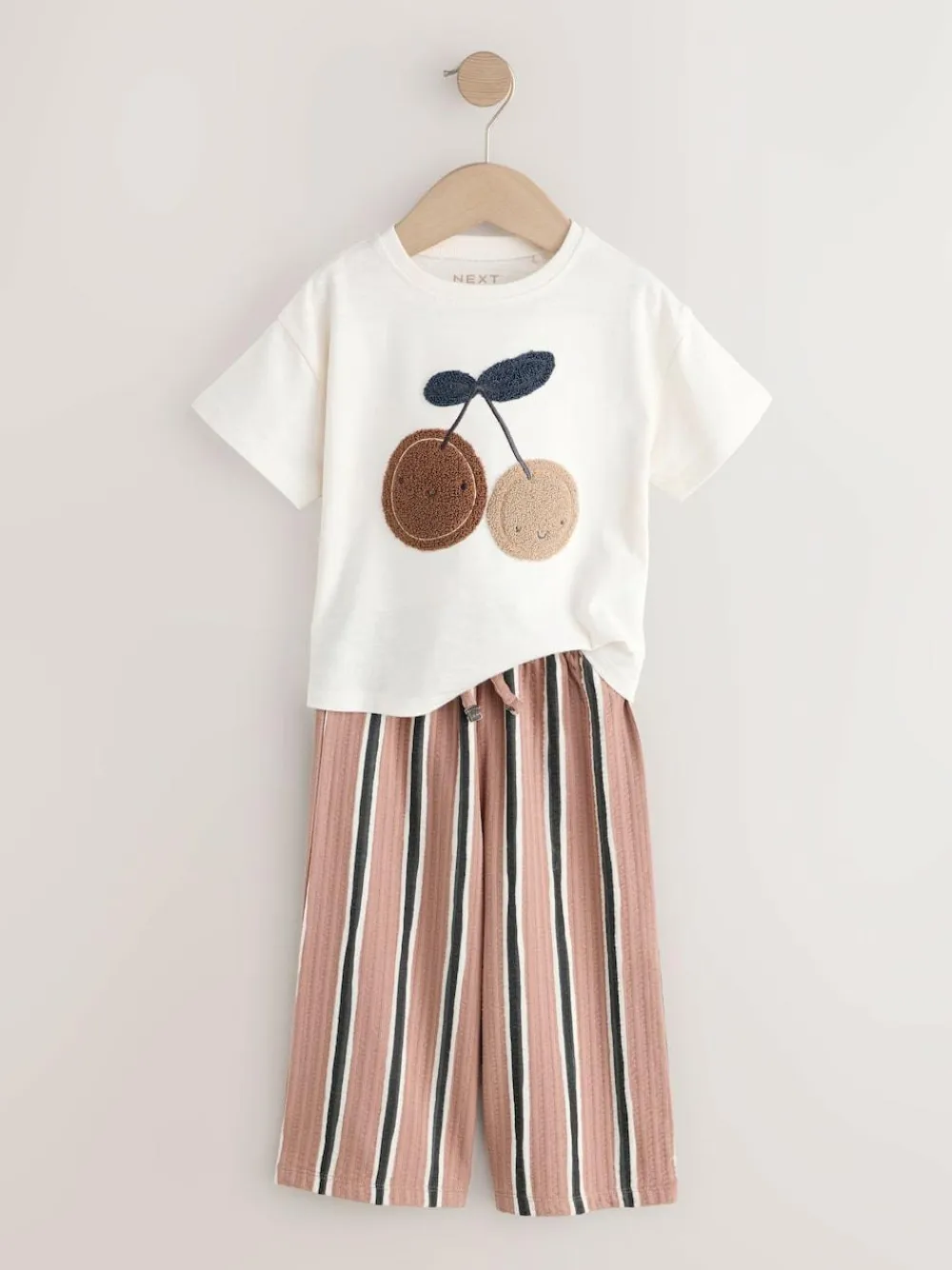 Bring some sweet, trendy style to your little one’s wardrobe with this adorable Ecru/ Brown Cherry Short Sleeve Top and Barrel Trousers Set. The top features charming boucle cherry appliqué for a fun, textured detail they’ll love. Paired with comfortable, striped Barrel Trousers, this outfit is an easy and stylish choice for casual adventures. Boucle cherry appliqué Short Sleeve Top Barrel Trousers Set Machine washable. T-shirt and Trouser 100% Cotton.
