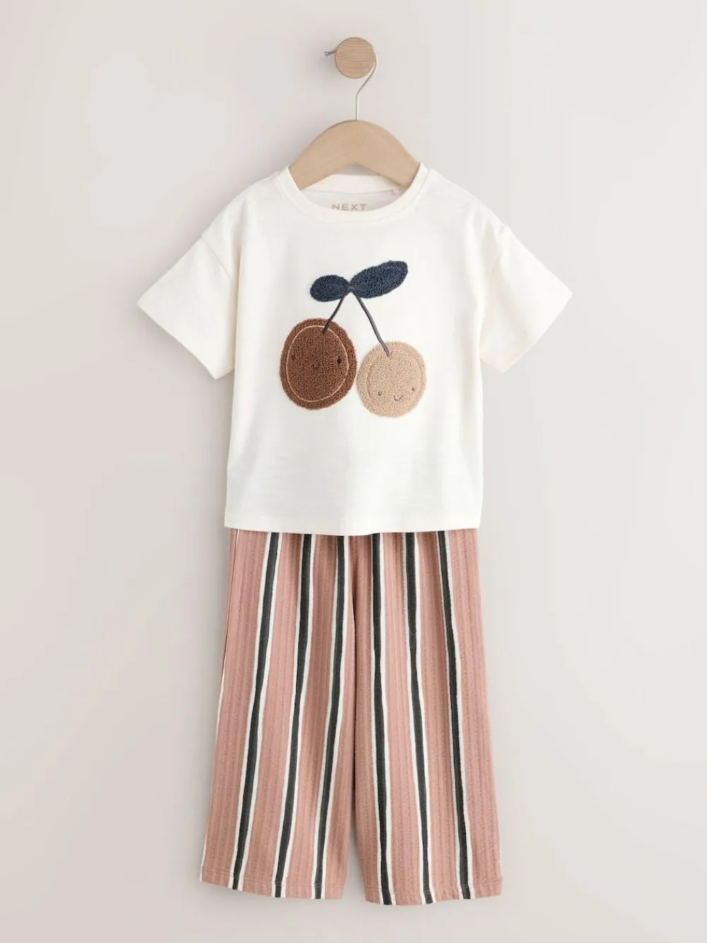 Next Ecru/ Brown Cherry Short Sleeve Top and Barrel Trousers Set (3mths-7yrs)^ Baby Girls|Tops