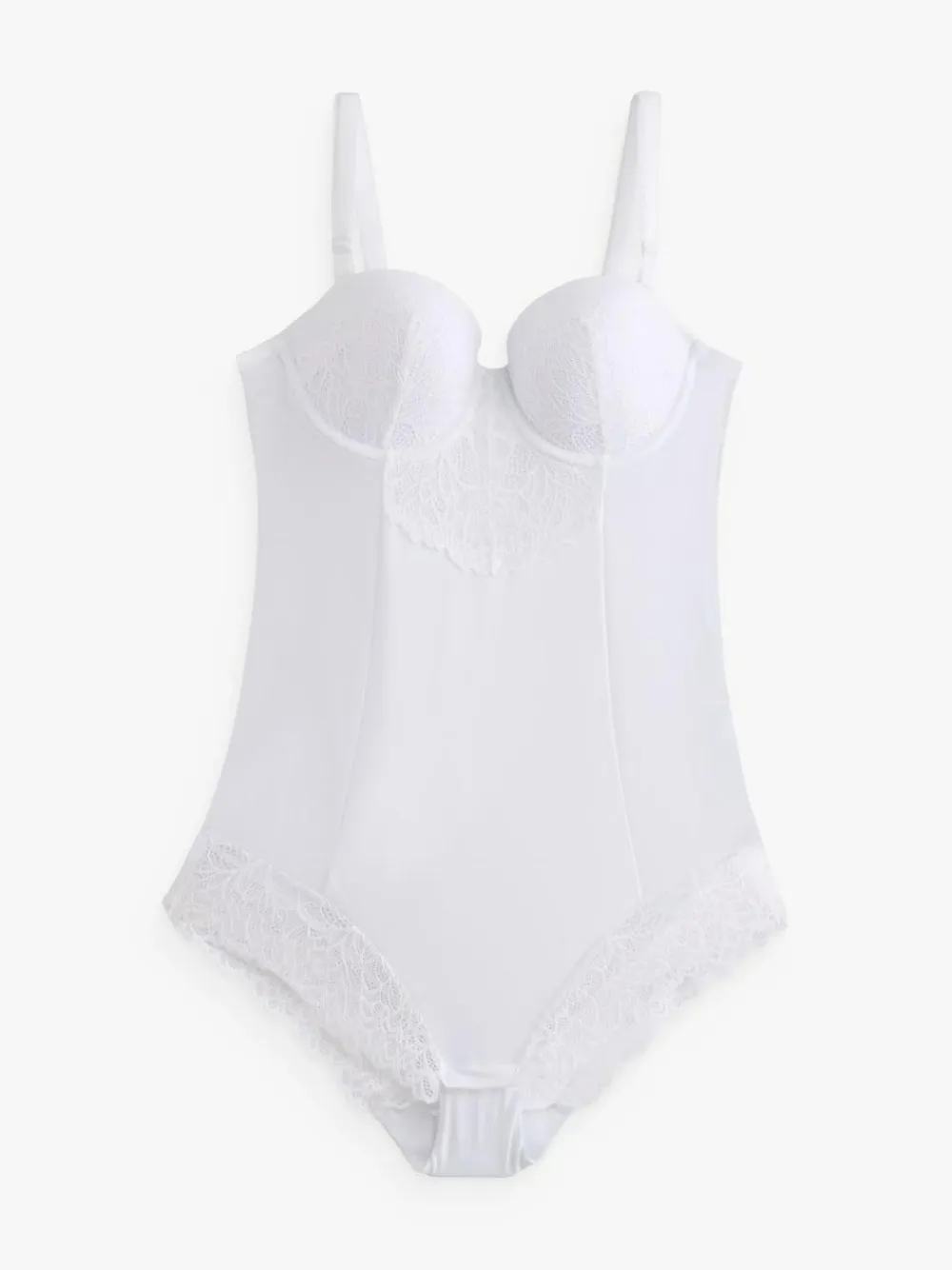 Slip into our firm white tummy control cupped lace body for ultimate confidence. Crafted from a blend of nylon and elastane with a touch of cotton for that extra softness, it discreetly shapes and smooths your silhouette for your favourite body-hugging outfits. Featuring multi-way straps, this lace body can be worn regular, strapless, halterneck, or crossback, so it’s always ready to adapt to your outfit. The elegant lace detailing adds a delicate feminine touch for that extra elegance. Lace body Multi-way straps Tummy control Machine washable. Main 71% Nylon, 14% Elastane, 10% Recycled Nylon, 5% Polyester. Gusset 100% Cotton.