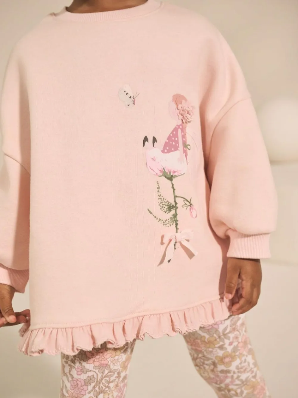 Dress her in playful charm with this sweet floral fairy frill hem sweatshirt and leggings set, perfect for comfortable casual wear and everyday fun. This two piece set is made from cosy brushed jersey fabric and features a charming broderie hem detail on the top. Two piece set Cosy brushed jersey fabric Floral fairy design Features broderie hem detail and 3D bow Includes flared leggings Casual wear Machine washable. Sweater 85% Cotton, 15% Recycled polyester. Leggings 94% Cotton, 6% Elastane.