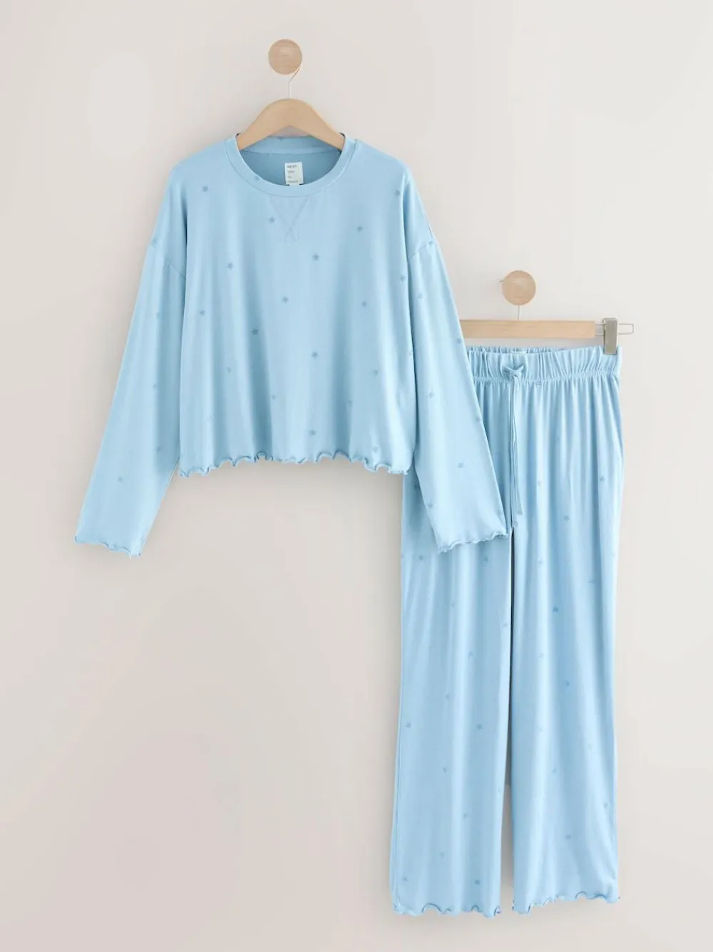Relax in heavenly comfort with these Blue Star Soft Long Sleeve Pyjamas. This set is designed to be super soft and comfy, crafted from a light blue fabric scattered with a subtle star print. The top features a cosy, slouchy fit and long sleeves, while the wide-leg trousers have a comfortable elasticated drawstring waist. Both the top and trousers are finished with a delicate, feminine lettuce edging along the hems, making this the ultimate set for restful evenings. 2 piece set Super soft and comfy Elasticated waist Machine washable. Pyjama Top and Pyjama Bottom 95% Recycled polyester, 5% Elastane. Warning: Keep away from fire and flames., Our tall collection is designed to fit women 5’10” and above. This has been proportionally increased through the body, leg and sleeve to achieve the perfect fit. Available in sizes 8-20.