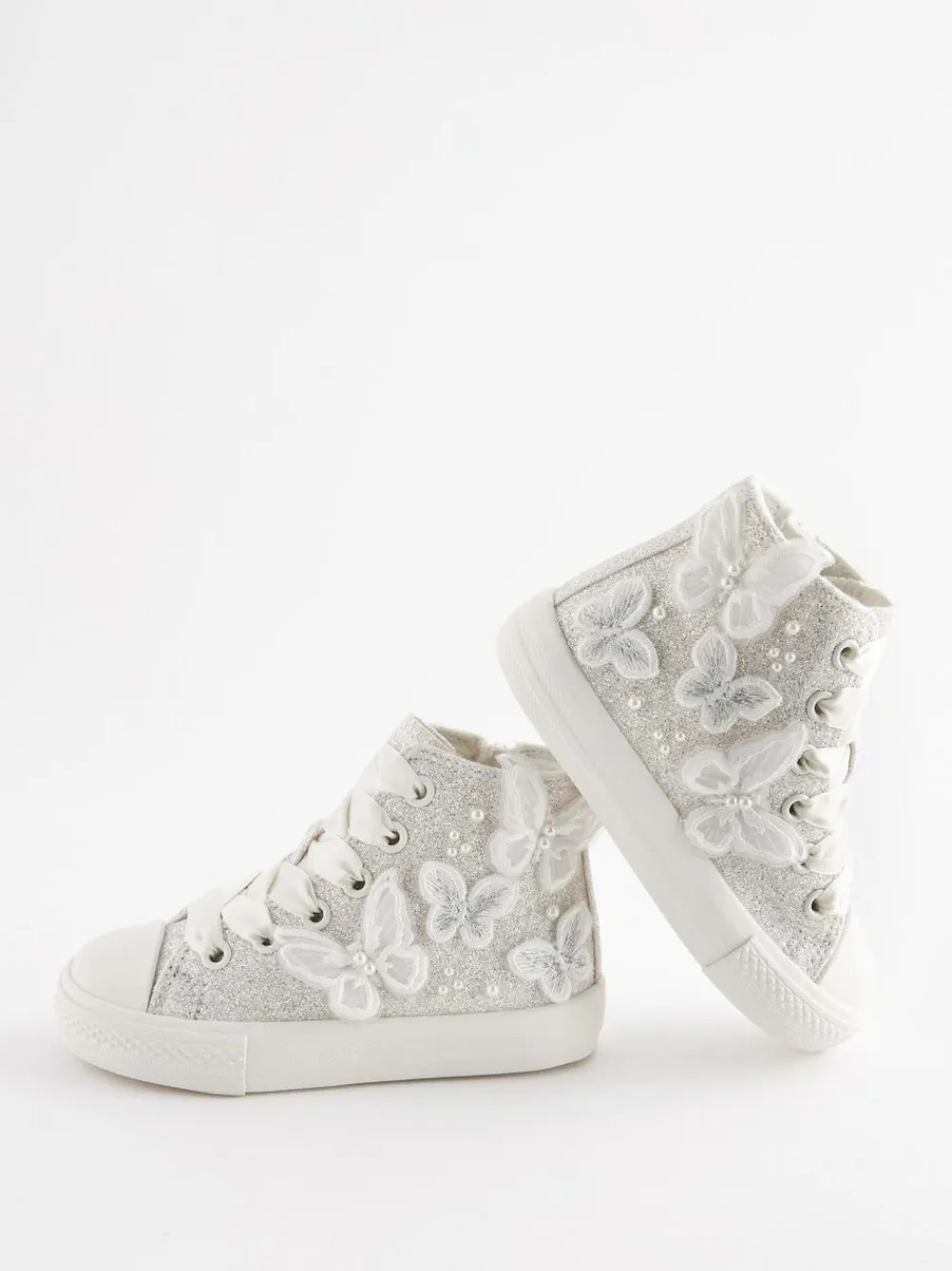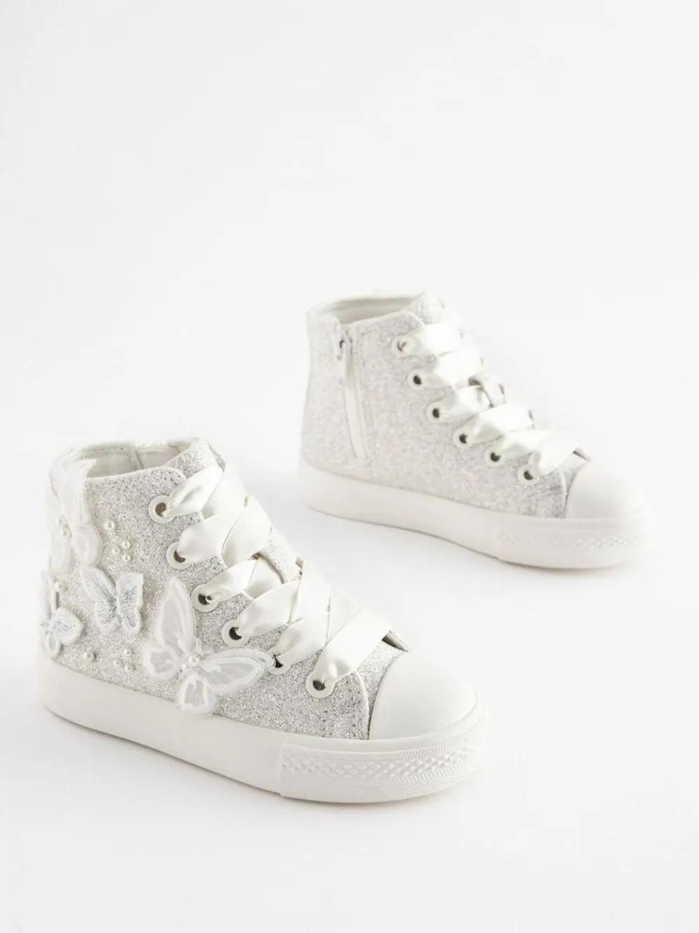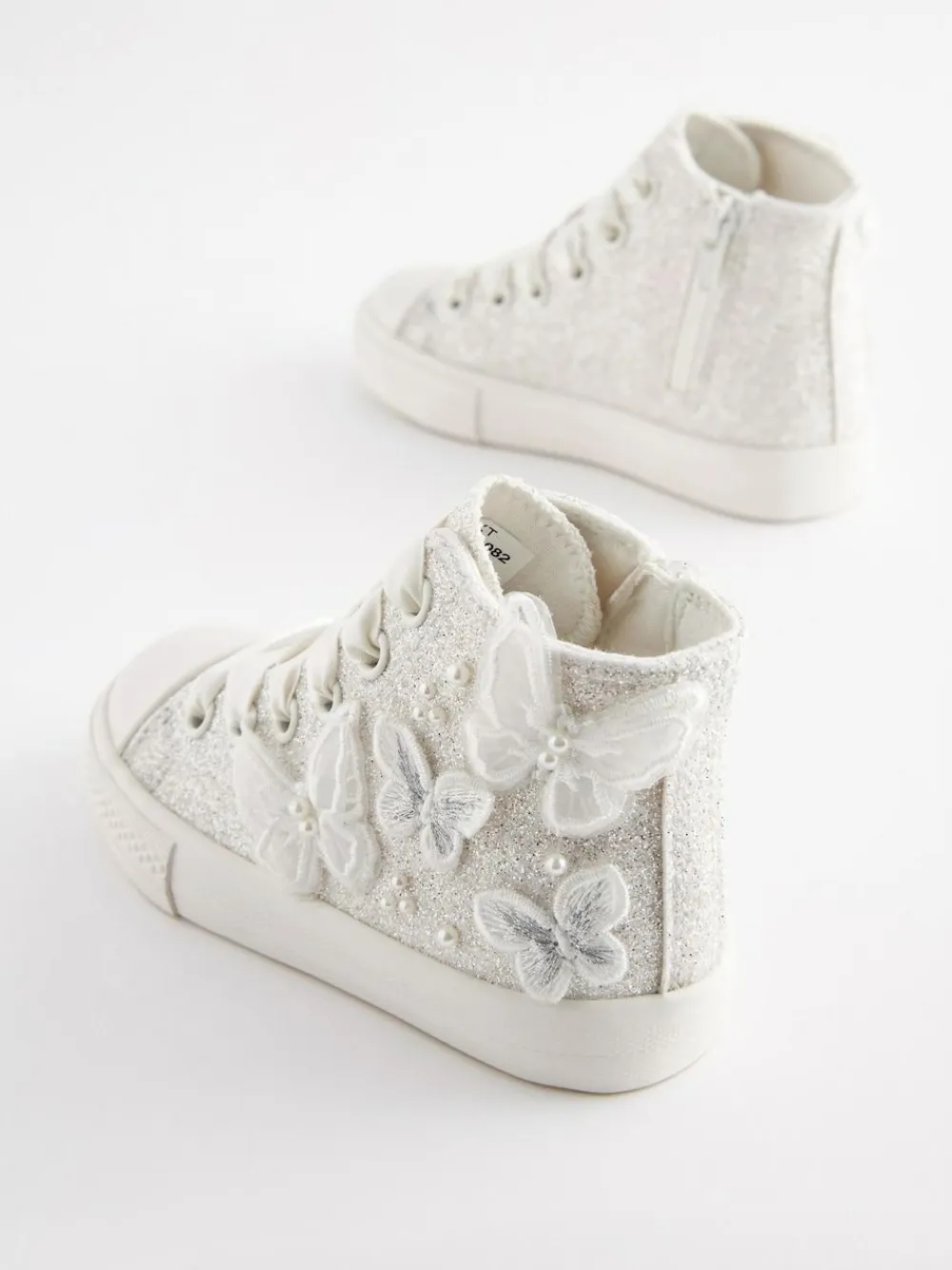 Add a touch of magic to her special occasion wardrobe with these dazzling high top trainers. Featuring enchanting butterfly details, they are perfect for parties or bridesmaids. They offer versatile styling with an alternative lace option and a handy inside zip for easy fitting. The slip-resistant durable sole ensures secure steps. Includes an alternative lace option Ideal for bridesmaids and parties Slip resistant durable sole Inside zip for easy fitting Upper – Textile, Lining & Sock – Textile, Sole – Other Materials.