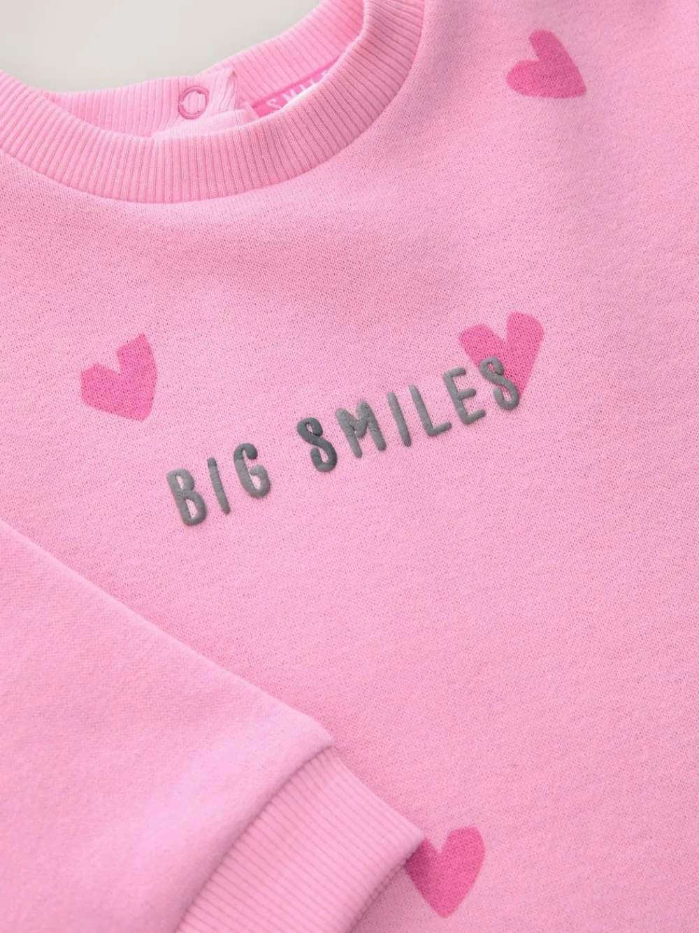 Popper leg opening Popper back placket Front slogan print Rib cuff on neck Sleeve and leg opening Machine washable. Main 82% Cotton, 18% Recycled polyester. Rib 94% Cotton, 6% Elastane. Warning: Keep away from fire and flames.