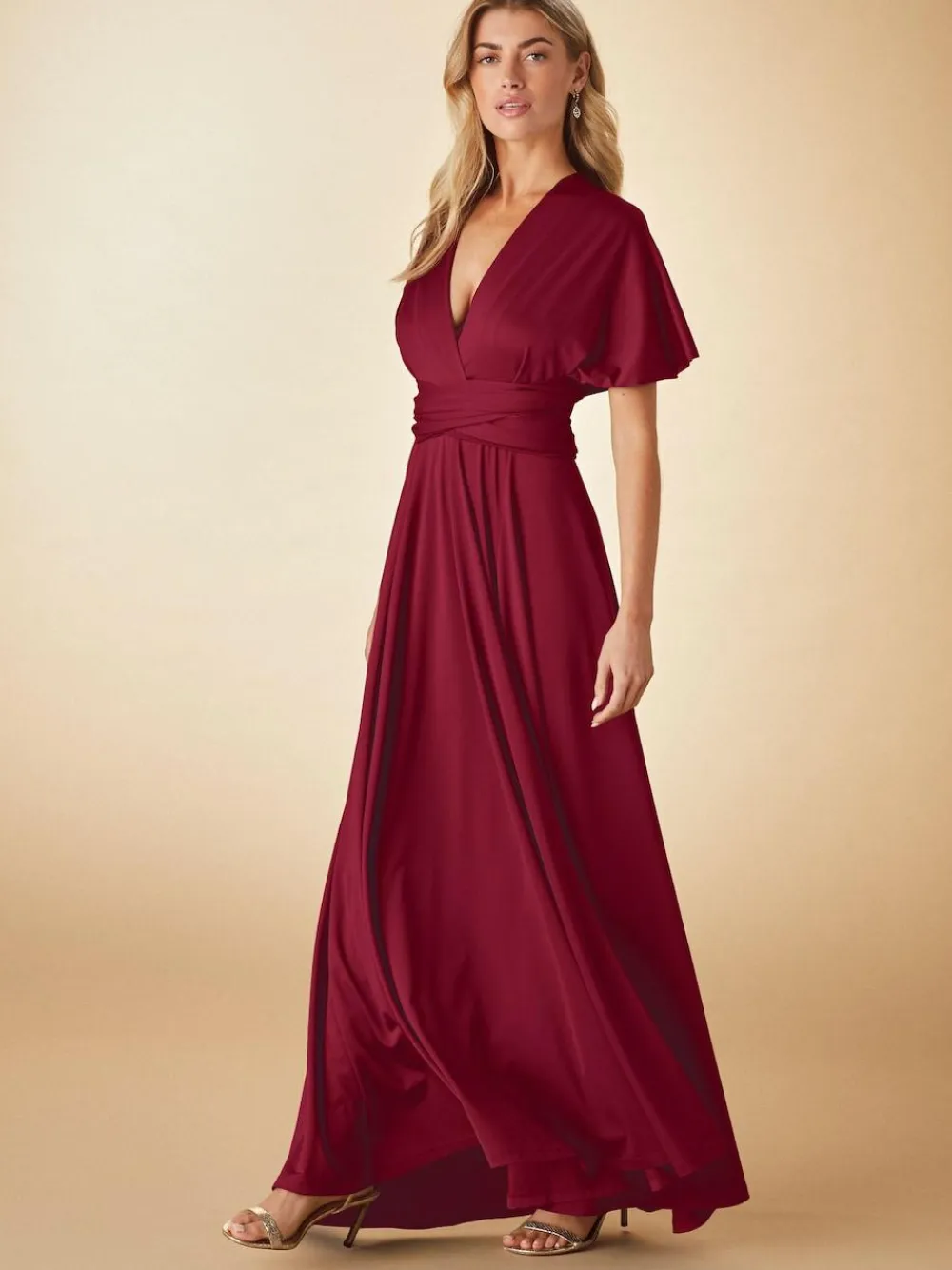 Our multiway wedding guest bridesmaid dress is the ultimate versatile and elegant style. A great choice if you have bridesmaids who all want something different, this multifunctional occasion dress can be styled in a whole host of different ways to create the perfect look. Made from an ultracomfort stretch jersey with an elasticated ruched waist, they are sure to feel their best for the big day or special occasion. Multiway dress One shoulder Bandeau Halterneck Off shoulder Open back Short sleeve Special occasion dress Machine washable. 95% Recycled polyester, 5% Elastane. Items with the curve logo are available in sizes 18 and above., Our tall collection is designed to fit women 5’10” and above. This has been proportionally increased through the body, leg and sleeve to achieve the perfect fit. Available in sizes 8-20.