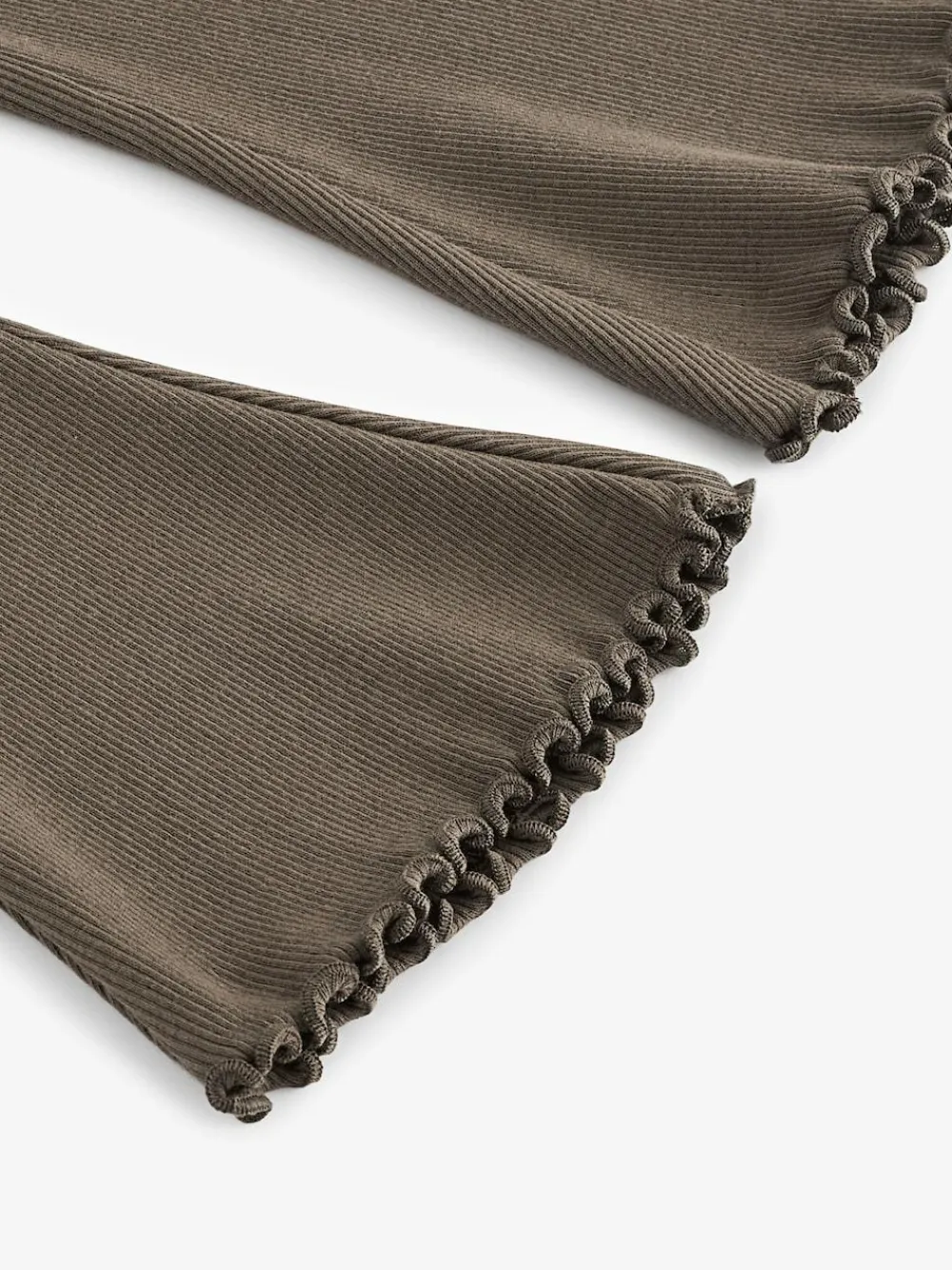 Level-up her everyday looks with our rib flare khaki green leggings. Made from a cotton rich blend for added comfort and finely finished with lettuce trim edges, an elasticated waistband and ribbed detailing. Ribbed cotton stretch fabric Elasticated waistband Pull-On style Wide-leg shape Lettuce trim edges Machine washable. 95% Cotton, 5% Elastane.