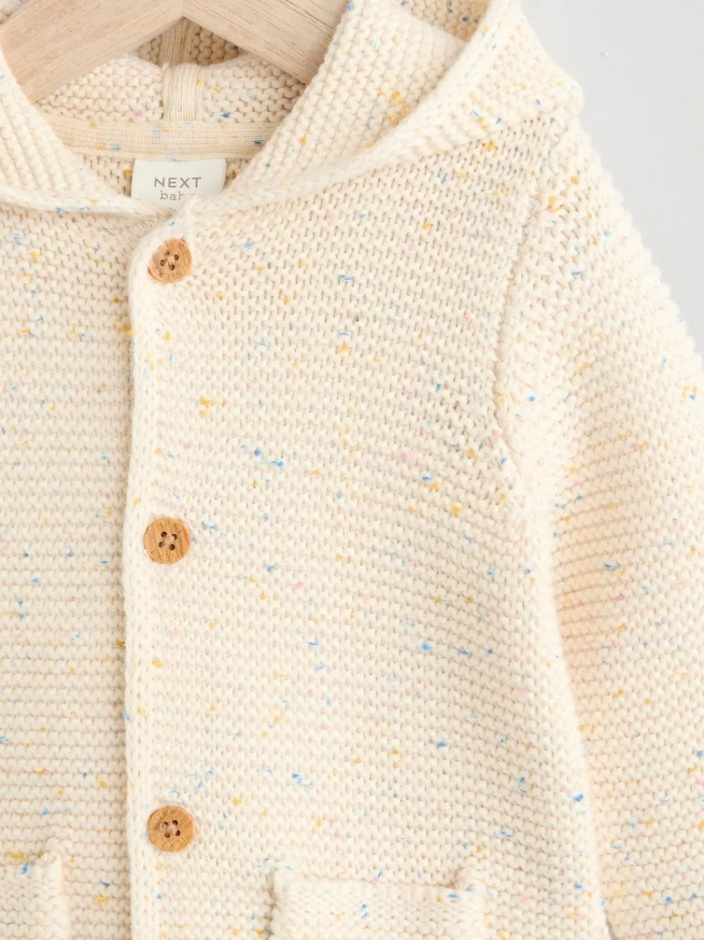 Keep them cosy and snuggled up in this adorable knitted cardigan. Made from supersoft cotton with a button-up front, patch pockets and cute hood with 3D ear detail. 100% cotton Button fastening 3D ear detail Patch pockets Machine washable. 100% Cotton. Warning: Keep away from fire and flames.