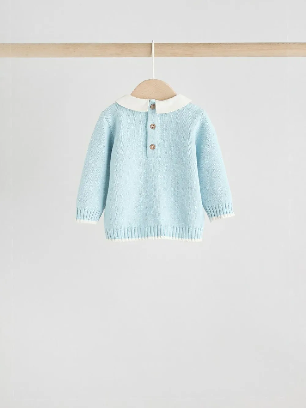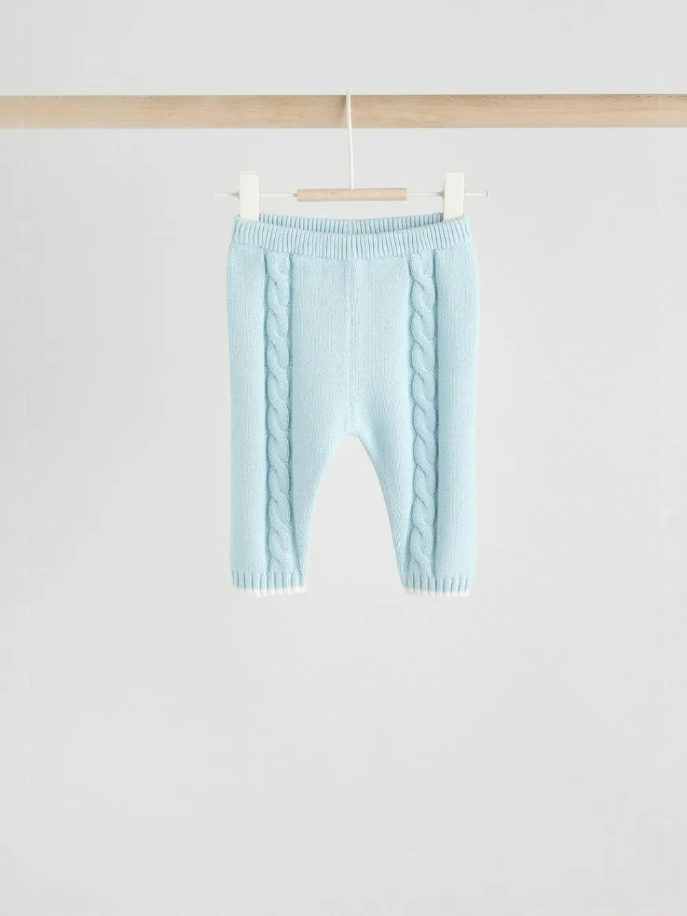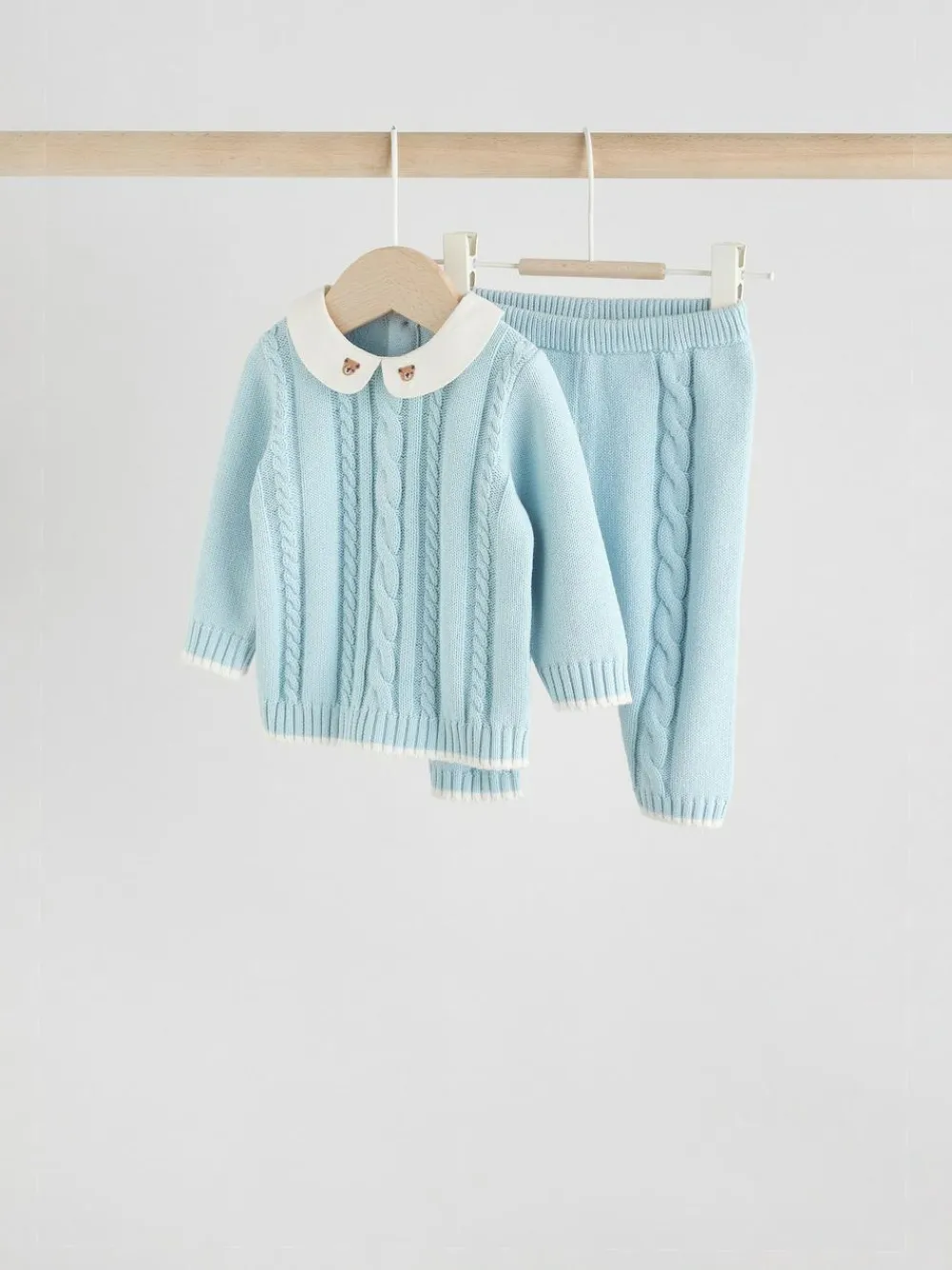 Get them ready for any occasion with this smart knitted set in blue. Made from pure cotton with a beautiful cable knit, the jumper features an elegant woven Peter Pan collar. With pull-on leggings, this set is a comfortable and stylish addition to their wardrobe. Pure cotton Cable knit Woven Peter Pan collar Pull-on leggings Machine washable. Jumper and Leggings 100% Cotton. Warning: Keep away from fire and flames.