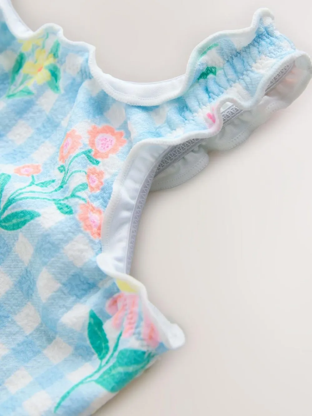 This sweet Blue Floral Swimsuit is perfect for holiday wear for your little one. Made from super stretchy fabric for comfort and freedom of movement, the swimsuit features delicate lettuce edge detailing, offering a charming look for pool time or the beach. Super stretchy fabric Perfect for holiday Lettuce edge detail Machine washable. Main 95% Recycled polyester, 5% Elastane. Lining 92% Recycled polyester, 8% Elastane.
