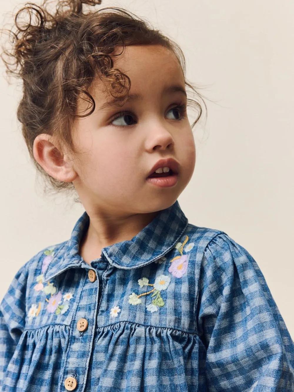 Step out in charming country style with this Denim Check Embroidered Long Sleeve Collar Dress. This delightful dress features a playful blue and white denim check pattern, beautifully enhanced by exquisite pretty floral embroidery across the chest and sleeves. It includes an adorable dolly collar and buttons at the front for easy dressing. The long sleeves finish with neat elasticated cuffs, giving the dress a cute, billowed shape and making it a perfect blend of sweetness and smart-casual style. Dolly collar Button detail Pretty floral embroidery Elasticated cuffs 100% Cotton.