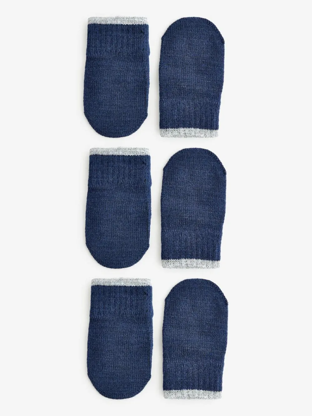 This 3 pack of Navy Blue magic mittens is essential for keeping little hands warm throughout the colder months. The stretchy, soft fabric ensures a comfortable fit and they are versatile enough to pair with any winter coat. These practical mittens are a wardrobe necessity. 3 pack Mittens style Stretchy fabric 3-9m + 1-2y: No thumbs 3-4y + 5-6y: With thumbs 3 x Gloves 55% Recycled polyester, 43% Acrylic, 2% Elastane.