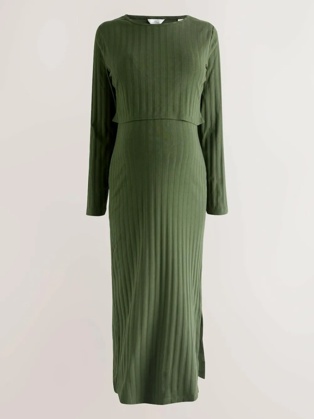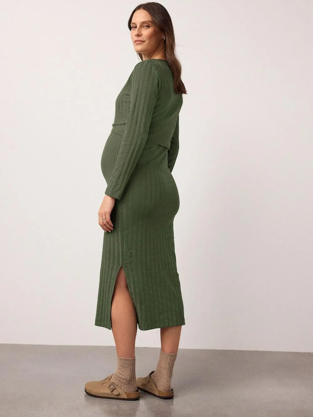 This stylish midi-length dress is perfect for both during and after pregnancy. Crafted from comfortable ribbed fabric, it features a discreet internal nursing layer for easy feeding access. The long sleeves and elegant side split make this a versatile and practical piece for sophisticated everyday wear. Midi length Rbbed fabric Internal nursing layer Long sleeve Side split hem Round neckline Maternity and nursing function 95% Cotton, 5% Elastane.