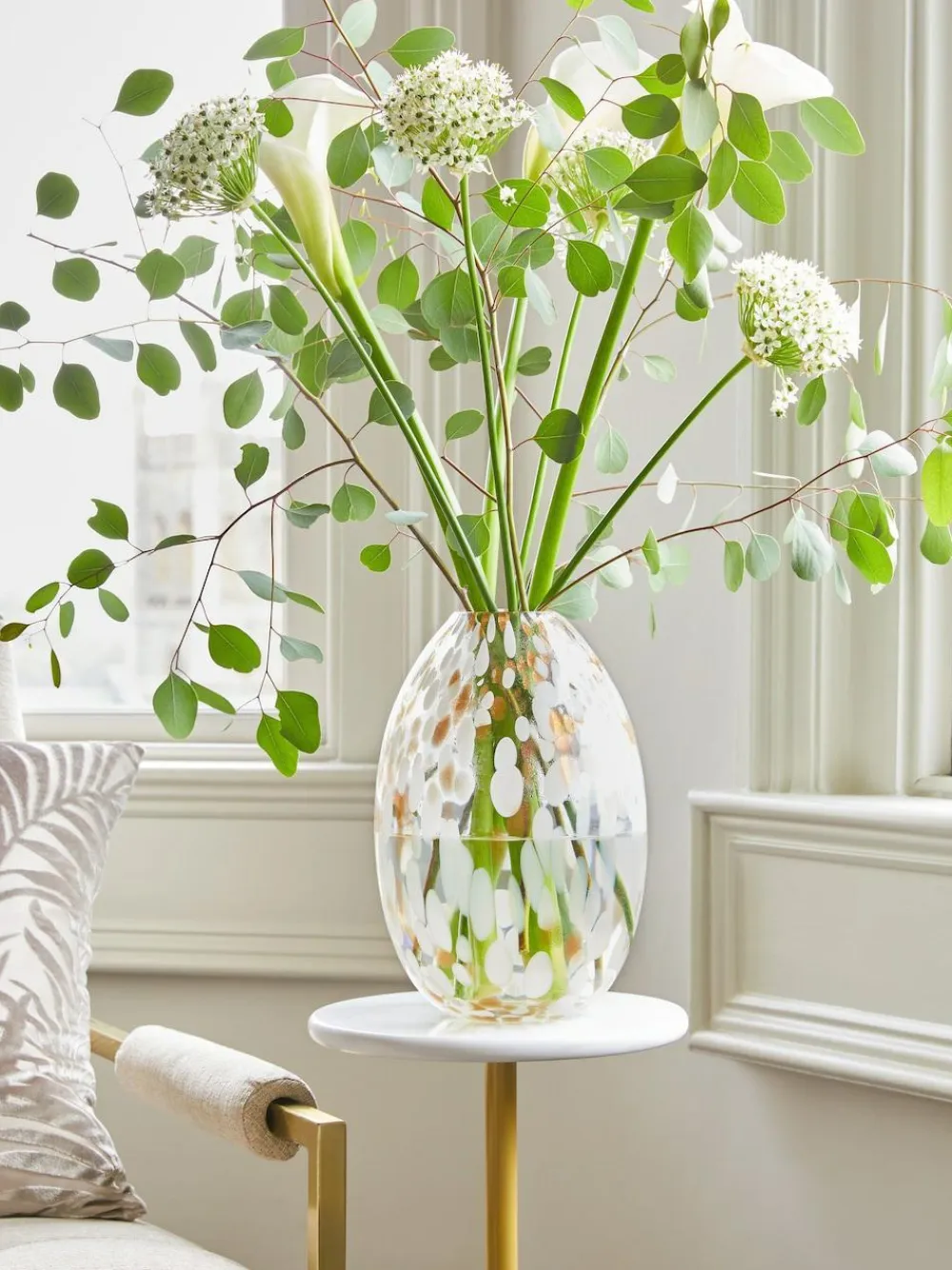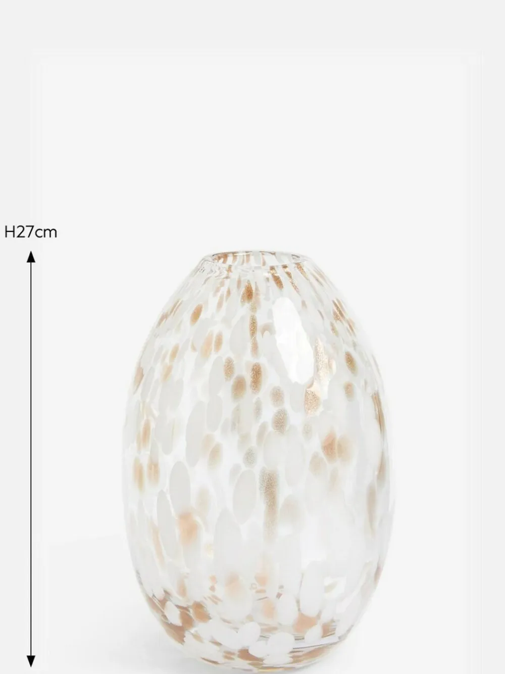 This stunning glass confetti vase is a combination of a special glass-blowing technique with a layering of gold and white confetti dots to create eye-catching vessels. Suitable for fresh flowers or faux floral. Please note every item will be unique due to the technique. Glass confetti vase Gold and with confetti dots Height 27cm Width 16cm Depth 16cm 100% Glass.