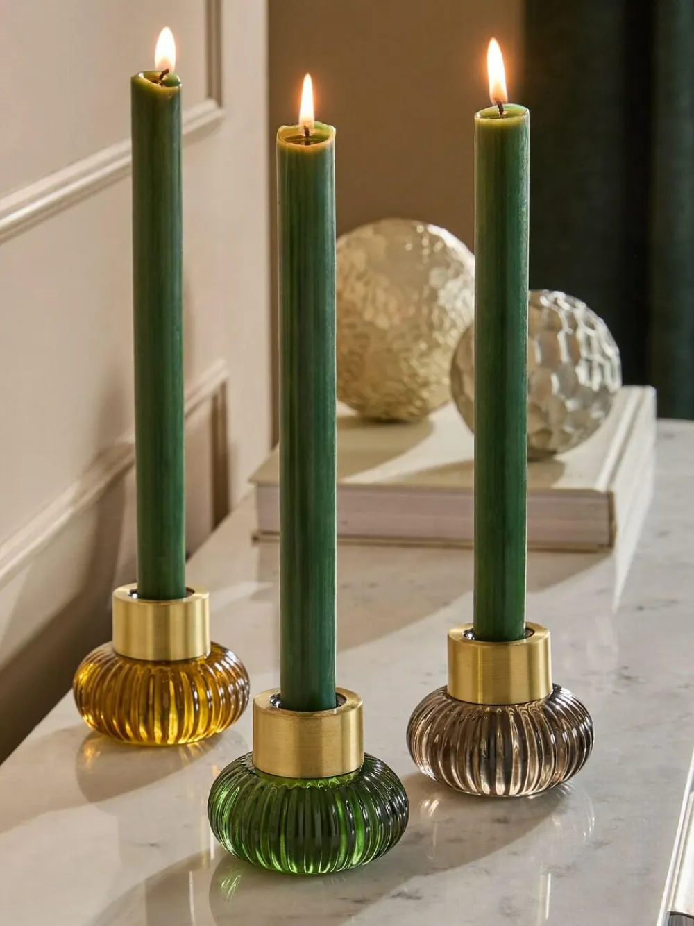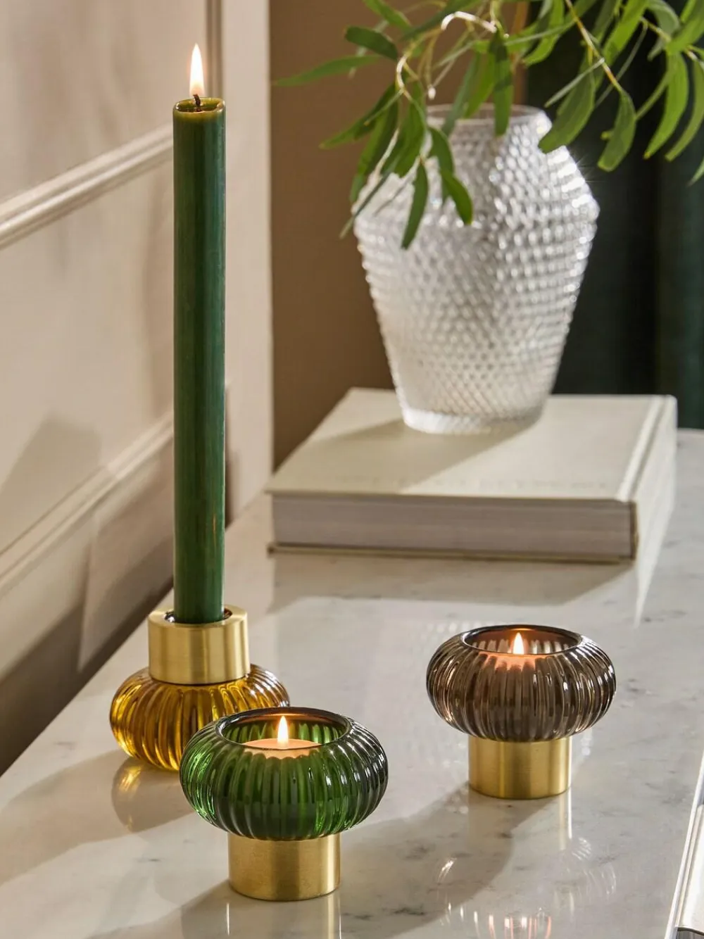 Add a touch of contemporary elegance to your space with this set of three ribbed glass candle holders. Their unique mushroom-inspired silhouette and rich jewel tones create a sophisticated and inviting ambiance. Perfect for showcasing taper candles or tea lights as they are multifunctional.Each piece is unique due to the varying nature of the natural material. Height 8cm Width 8cm Depth 6.5cm 80% Glass, 20% Metal.