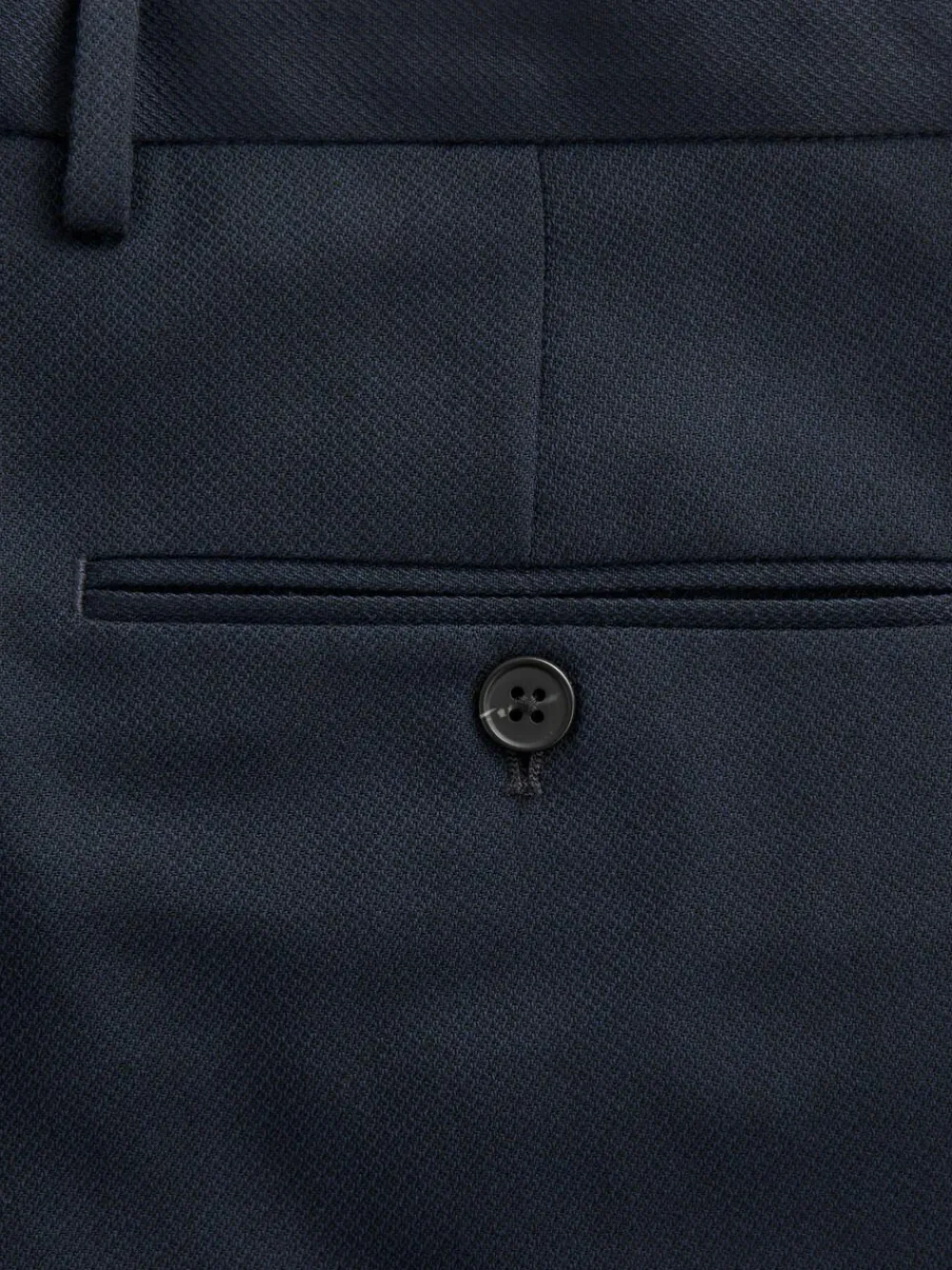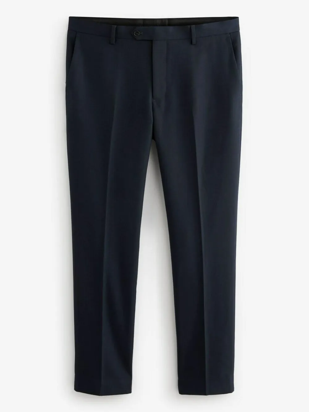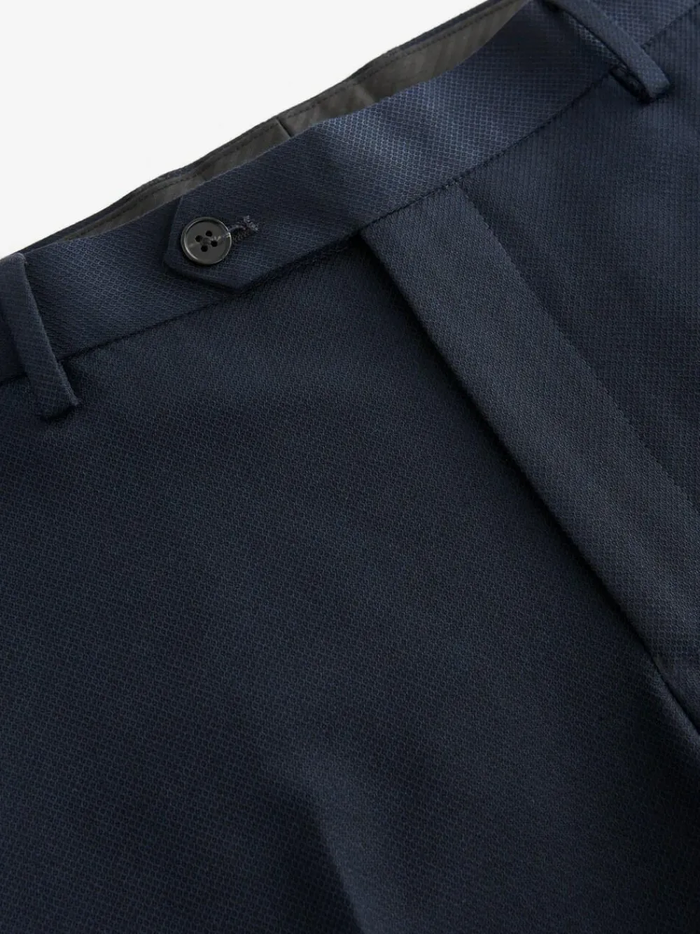 These stylish navy blue suit trousers have an elevated feel with a textured fabric finish, featuring side pockets, rear pockets and a button and fly fastening. Slim fit Textured fabric Side pockets Rear pockets Button and fly fastening Check out The Suit Shop for more inspiration: https://www.next.co.uk/men/the-suit-shop 62% Recycled polyester, 35% Viscose, 3% Polyester.