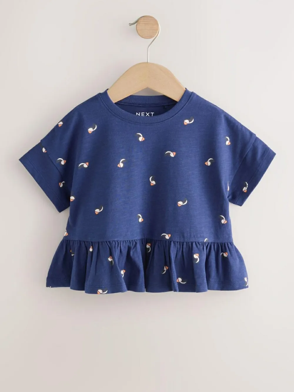 This short sleeve Navy puffin t-shirt is made from pure cotton, featuring a pretty peplum hem and a boxy shape, finished with drop shoulders and a crewneck collar. 100% cotton Boxy fit Drop shoulders All over print Peplum hem Machine washable. 100% Cotton.