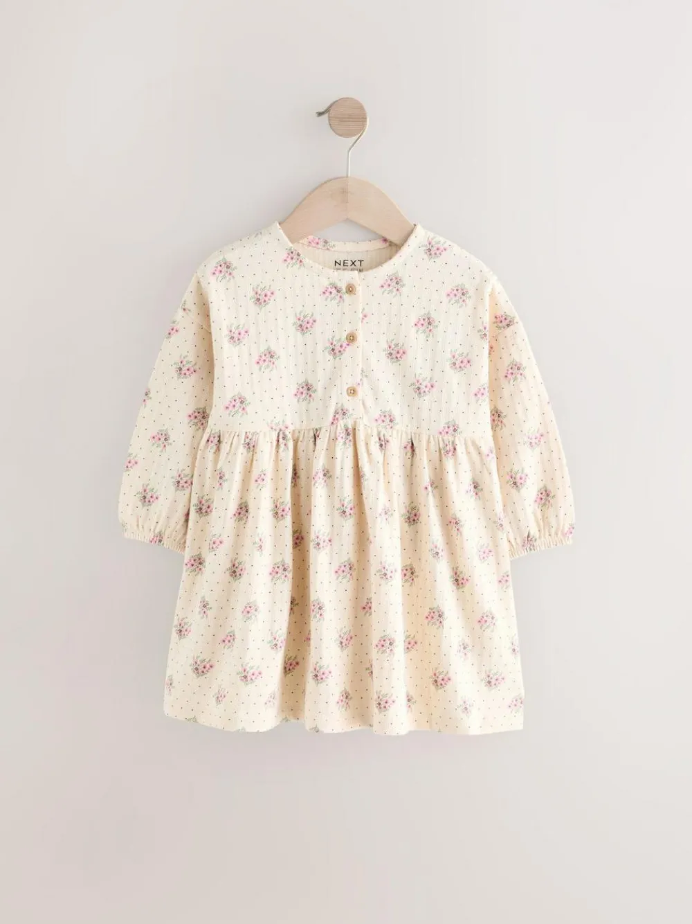 Made from a comfortable pure-cotton jersey fabric, this pretty dress has a textured feel with a button-up neck fastening, long sleeves with an elasticated sleeve cuff and an all-over ditsy flower print. 100% cotton Textured jersey fabric Button-up fastening Long sleeves Elasticated sleeve cuffs Ditsy flower print Machine washable. 100% Cotton.