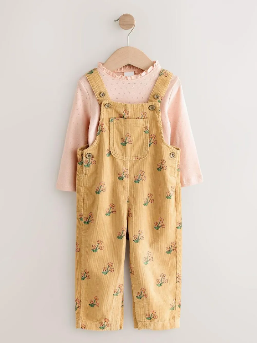 Next Ochre Yellow Floral Print Corduroy Dungarees and T Shirt Set (3mths-7yrs)^ Jumpsuits & Playsuits