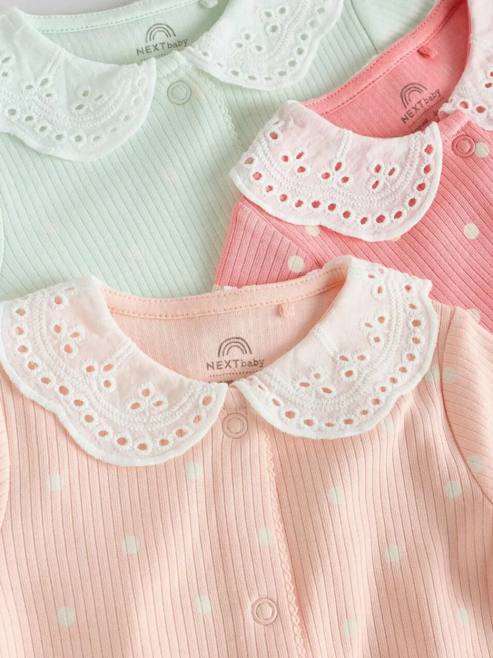 This 3-pack of pure-cotton sleepsuits have a lace collar for a cute look, featuring polka-dot prints set against a ribbed texture. A popper fastening makes changing a breeze, finished with turn-back scratch mitts for up to 3-6 months and anti-slip sole prints on the feet from 9-12 months. 3-pack 100% cotton Ribbed texture Polka dot print Lace collar Machine washable. 3 x Sleepsuit 100% Cotton. Warning: Keep away from fire and flames.