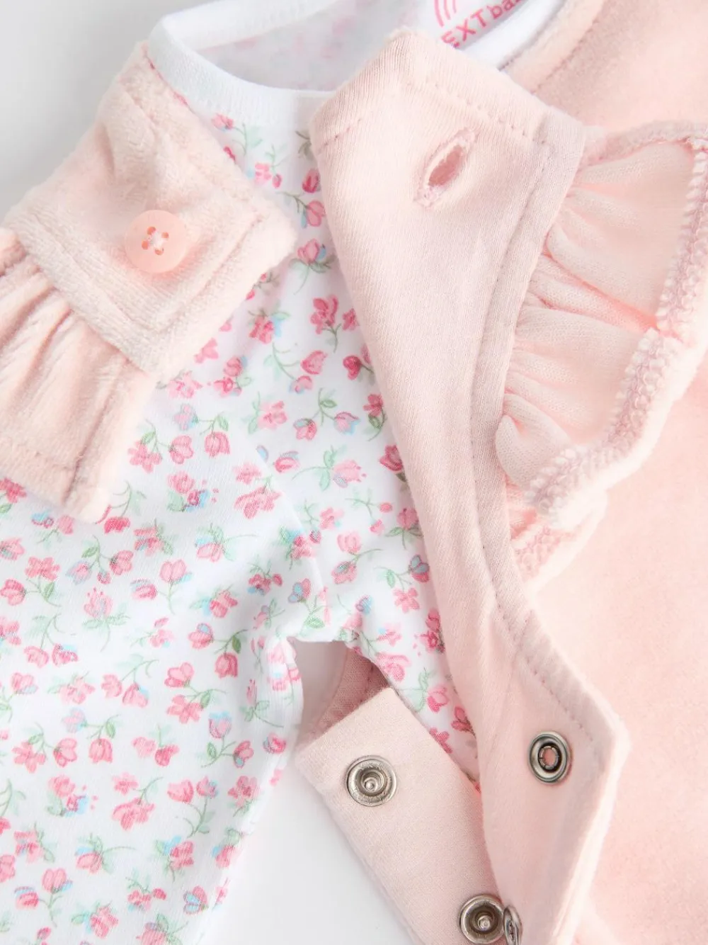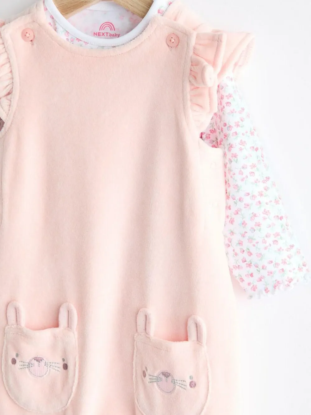 Made from a soft and comfortable cotton-rich blend fabric, this adorable 2-piece set features pink velour dungarees with ruffle detailing at the shoulders and bunny pocket detailing, alongside a long sleeve bodysuit in a floral design. 2-piece set Cotton-blend fabric Velour dungarees Ruffle shoulders Bunny pockets Long sleeve bodysuit Floral print Machine washable. Bodysuit 92% Cotton, 8% Elastane. Dungaree Main 80% Cotton, 20% Polyester. Lining 100% Cotton. Warning: Keep away from fire and flames.