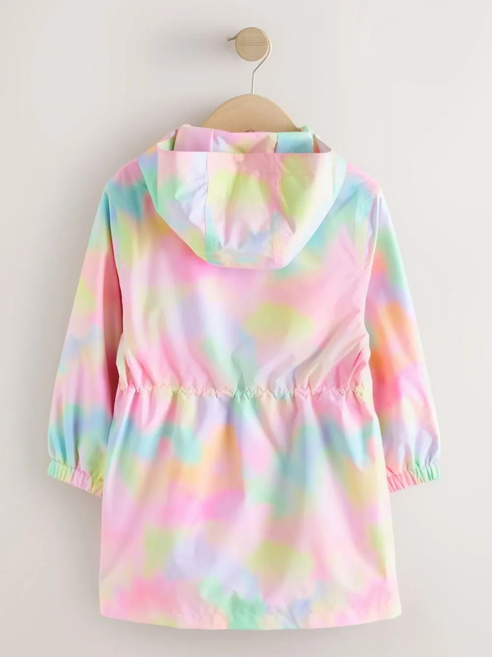 This bright Pink Marble Waterproof Printed Cagoule is a practical and colourful choice for wet weather. This cagoule is waterproof and fully lined. The images show a tie-dye or marble print in shades of pink, yellow, and blue, with a hood, zipper and snap fastening, and an adjustable waist. Waterproof and fully lined Cagoule style Pink Marble Printed design Machine washable. Main 100% Recycled polyester. Lining 100% Cotton. Sleeve Lining 100% Recycled polyester.