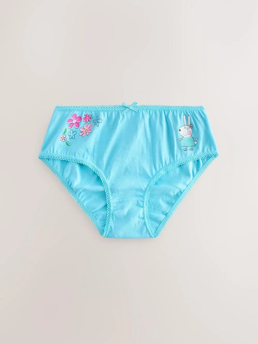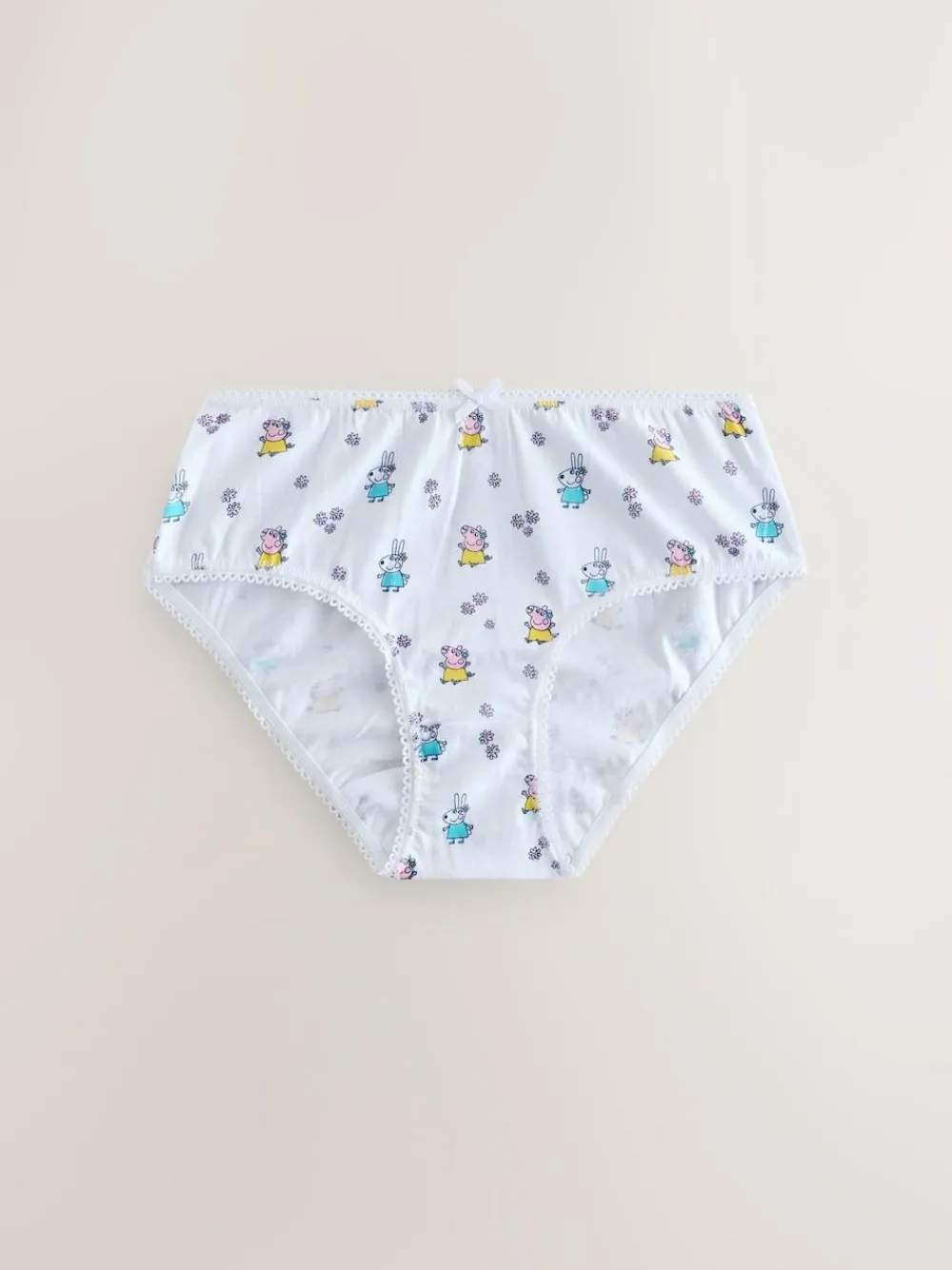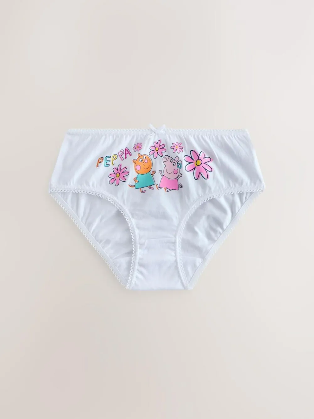 Keep them comfortable with this five-pack of pink and blue briefs. The classic brief shape, with a high-rise waist and a double-layered gusset, provides all-day comfort. Made from a super-soft cotton with added stretch for shape retention, they feature fun Peppa Pig prints for a playful touch. Peppa Pig designs 5-pack Cotton with added stretch Double-layered gusset Elasticated lace trim Machine washable. 5 x Knickers 100% Cotton.