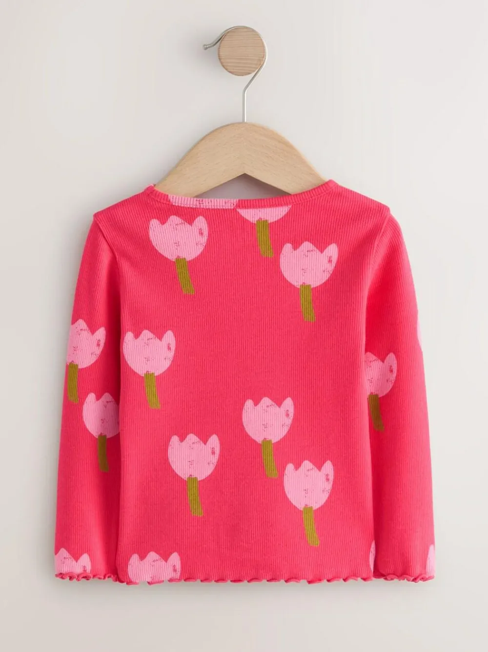 Add some fun to their everyday staples, with this Pink and Red long sleeve rib t-shirt with flowers, available in a selection of bright colours and prints, set against a cotton-rich base with added stretch. The t-shirt is finished with a ribbed crewneck collar and a ruffle trim the sleeve cuffs and hem. Cotton-rich blend Long sleeves Crewneck collar Ruffle trim Machine washable. 95% Cotton, 5% Elastane.