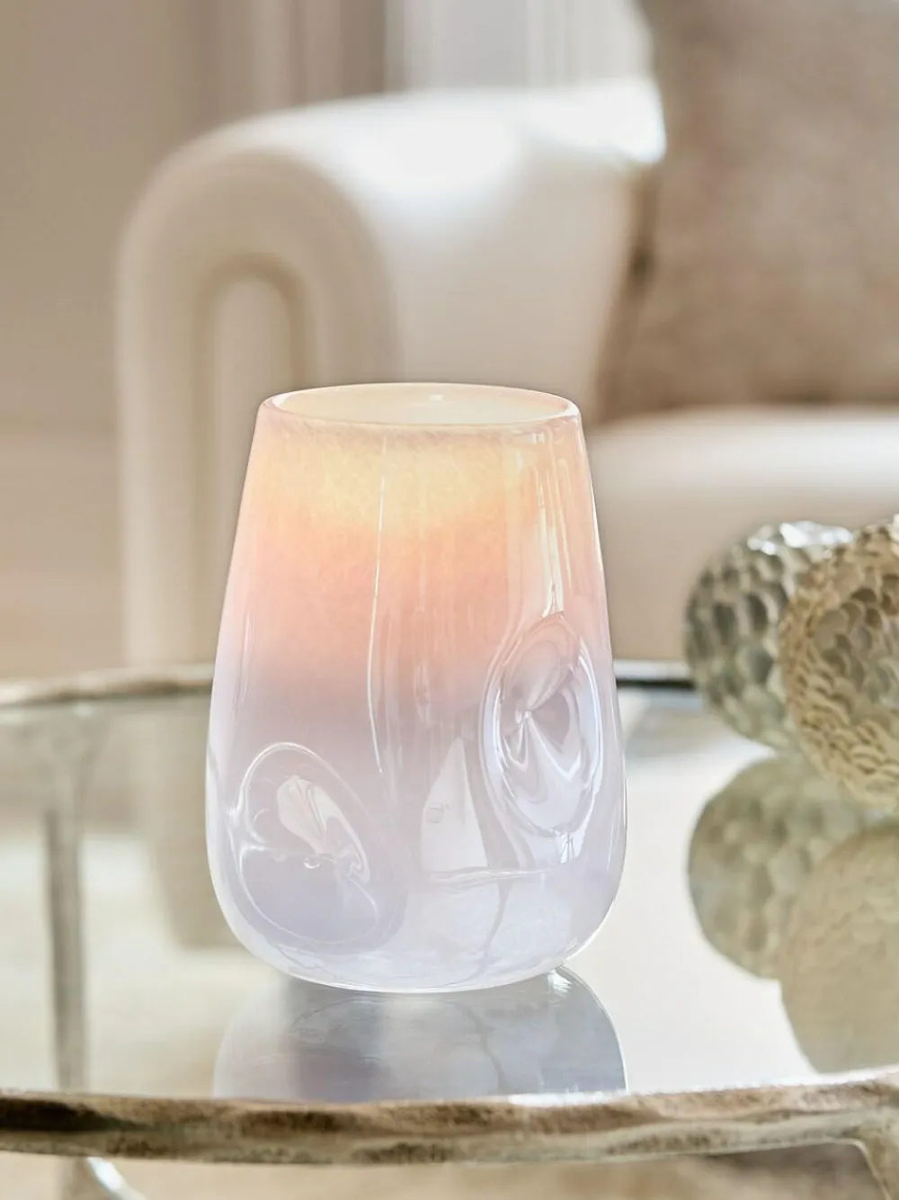 Create a serene and inviting atmosphere with this beautifully crafted glass candle holder. Its soft, blended hues of purple and lustre finish, create a gentle and calming glow when lit. A perfect addition to your relaxing moments. Height 20cm Width 15cm Depth 15cm 100% Glass.