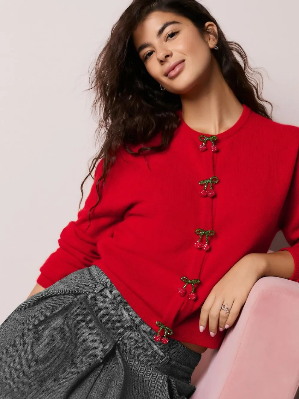 Next Red Cherry Buttons Crew Neck Knitted Cardigan With Wool^Women Occasionwear|Knitwear
