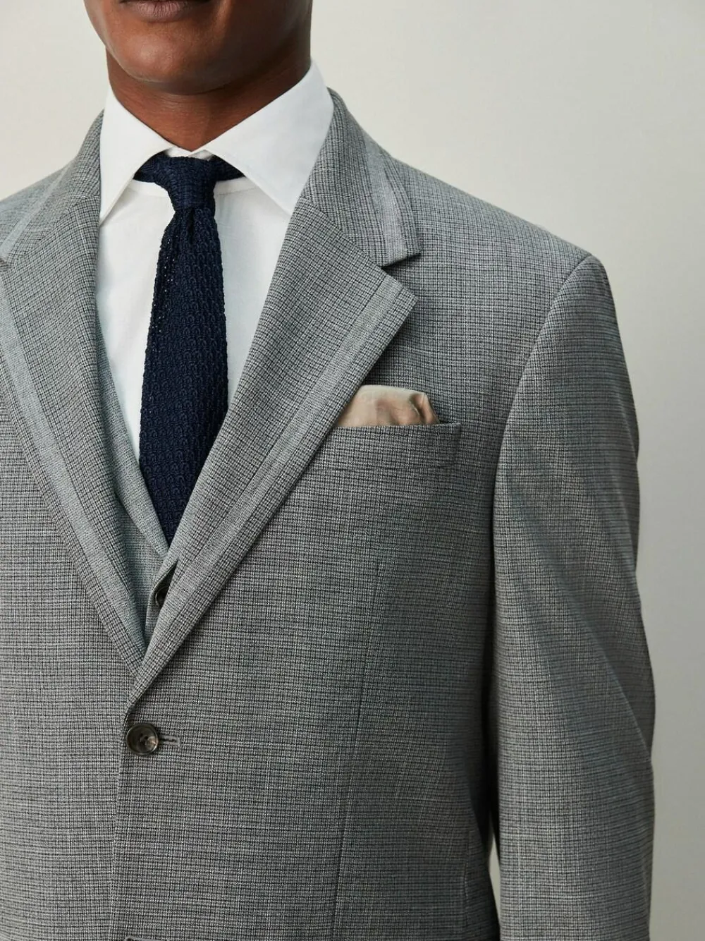 This sharp Suit Jacket features a sophisticated grey check fabric, offering a polished look for formal wear. It’s detailed with contrast fabric trim on the pockets, a classic notch lapel, and practical 4 button cuffs. The added pull-out pocket square allows for instant accessorising, making this jacket a tailored choice for any event. Grey Notch lapel Contrast fabric trim detail 4 button cuff Pull-out pocket square Button fastening Main 69% Recycled polyester, 29% Viscose, 2% Elastane. Lining 100% Recycled polyester.