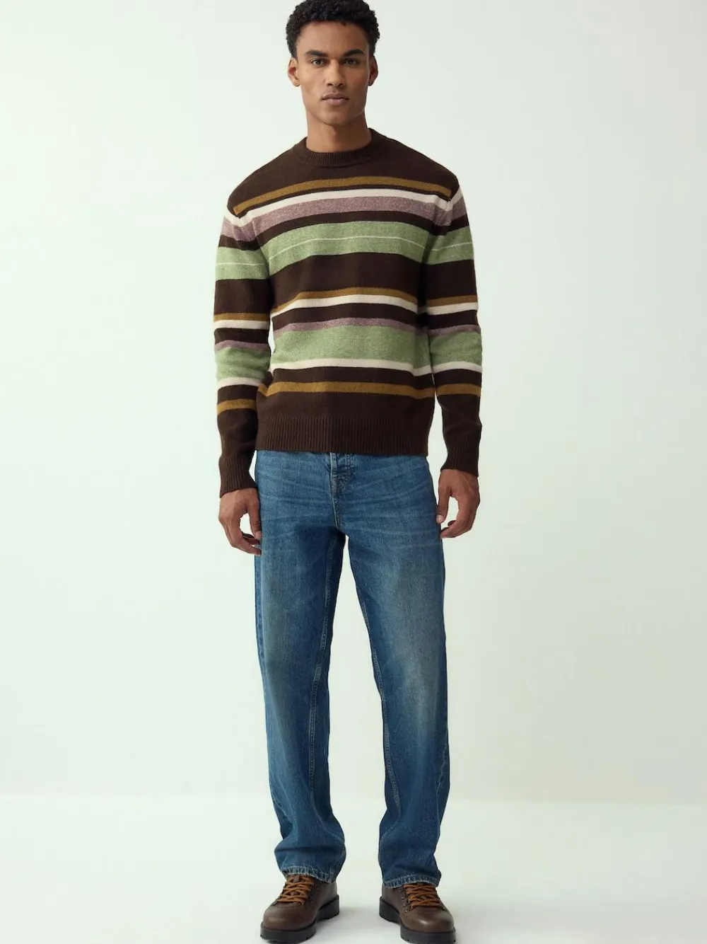 Embrace warmth and colour with this Regular-Fit Cosy Stripe Crew Jumper. Coming in brown and sage green, it’s crafted from a wonderfully cosy yarn with wool content, ensuring superior warmth and a soft feel. The bold stripe pattern in earthy tones adds an on-trend touch, while the classic crew neck and regular-fit make it an effortless layer for cold-weather casual-wear. Available in standard sizes. Cosy yarn with wool content Bold horizontal stripe pattern Classic crew neck Comfortable regular-fit Available in standard sizes Best for cosy cold-weather-wear Machine washable. 64% Recycled polyester, 14% Acrylic, 11% Lyocell, 7% Nylon, 4% Wool.