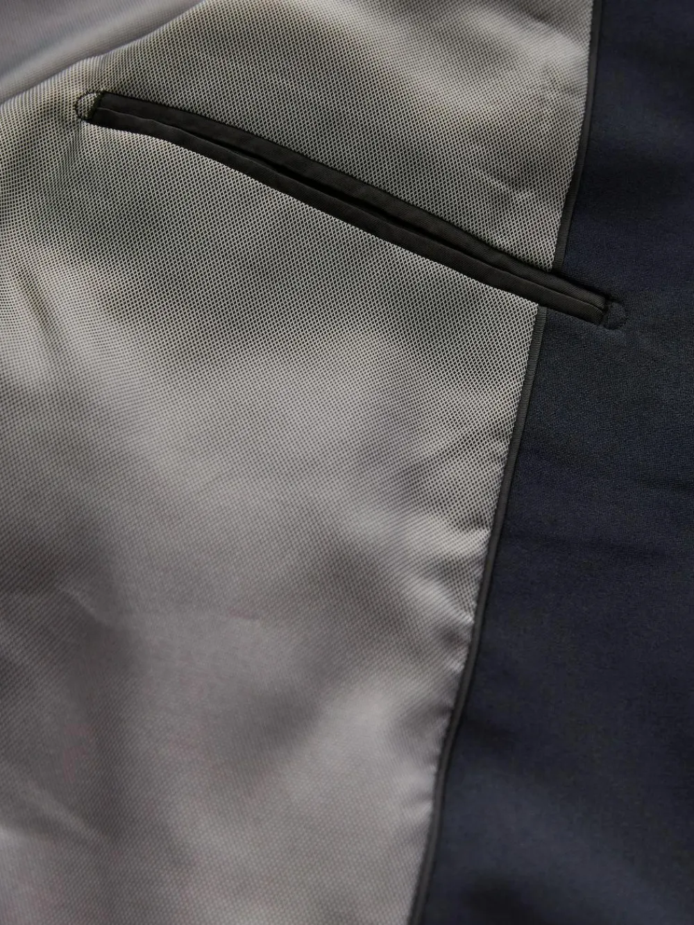 Handle a smart dress code in style with our Essential suit jacket in navy blue. Featuring a single breasted cut with two front pockets, buttoned sleeves and a smart notched lapel collar. Smart, easy to wear and guaranteed to draw good attention, style with a shirt and tie or dress down with a fine knit for endless appeal. Suit jacket Regular fit Single-breasted Chest pocket Buttoned sleeves Notched lapel collar Check out The Suit Shop for more inspiration – https://www.next.co.uk/men/the-suit-shop Main 100% Recycled polyester. Lining 100% Polyester.