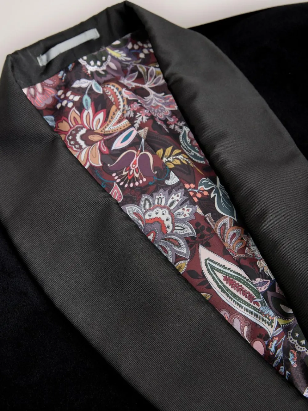 Indulge in luxury with this Signature black velvet blazer, crafted from Italian velvet by the Pontoglio mill. The elegant shawl lapel and regular fit create a distinguished silhouette. A striking jacquard lining and premium fabric make this the perfect choice for weddings or any special occasion. Regular or slim fit Italian velvet Shawl lapel Jacquard lining Single-button fastening Dry clean only. Main 100% Cotton. Lining 100% Recycled polyester.