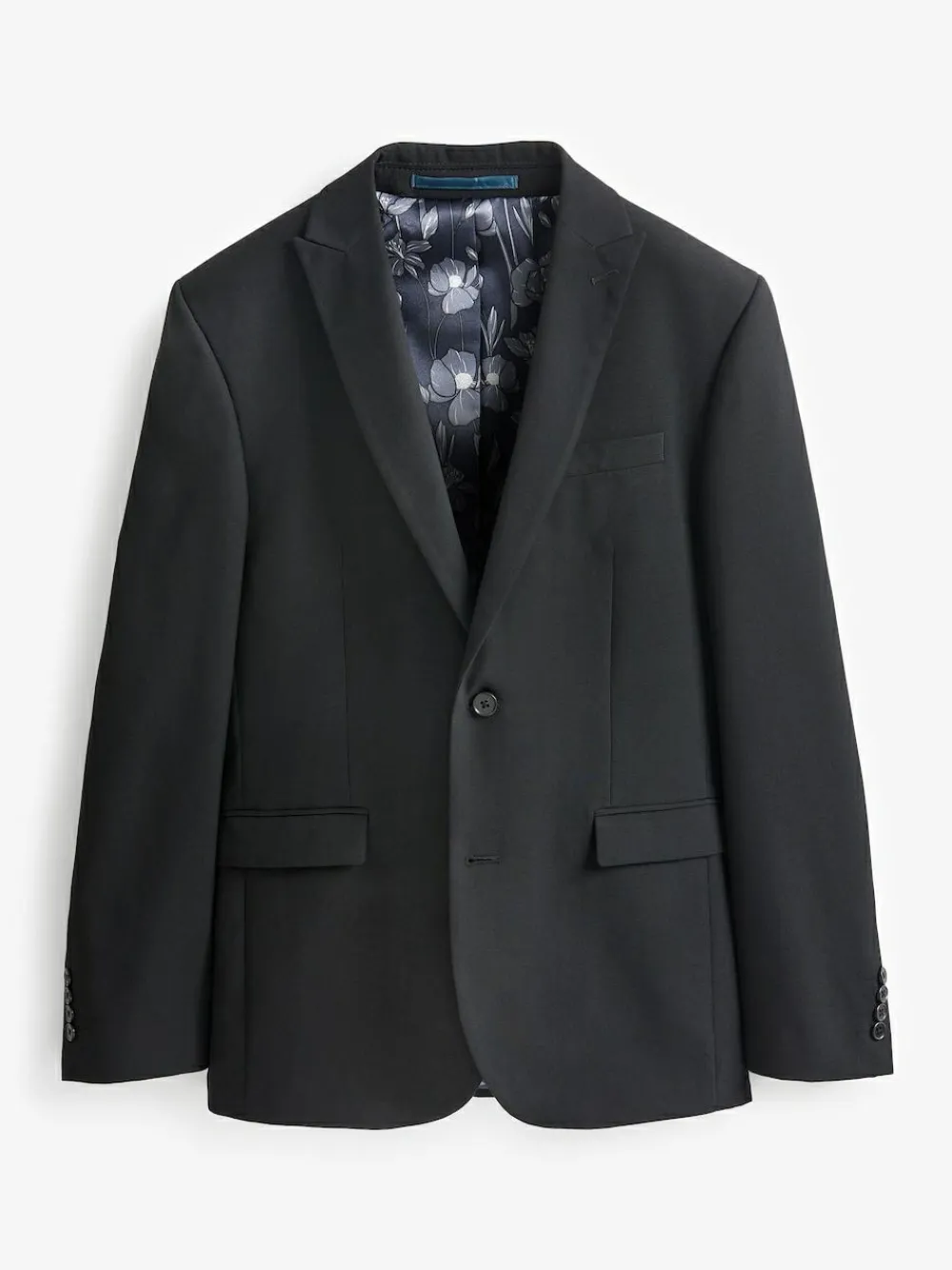 This stylish two button suit jacket in black reflects our finesse for designing more affordable tailoring. Crafted in a machine washable fabric, it’s detailed with everything you could expect from a classic suit, including twin back vents, a peaked lapel and neat flap pockets. Complete the look with matching suit trousers for a versatile, smart look that will see you through the seasons. Suit lining may differ from imagery. Two button suit jacket Regular fit Peaked lapel Twin back vents Flap pockets Satin lining Machine washable Check out The Suit Shop for more inspiration:https://www.next.co.uk/men/the-suit-shop Machine washable. Main 62% Recycled polyester, 35% Viscose, 3% Polyester. Lining 100% Recycled polyester. To view our Men’s Suit Fit Guide CLICK HERE Indicates styles available in Tall sizes with longer sleeves & body , Indicates styles available in Bigger chest or collar size