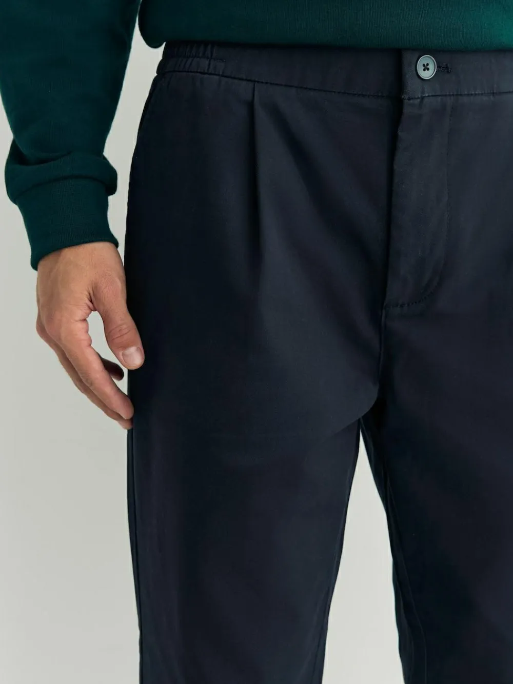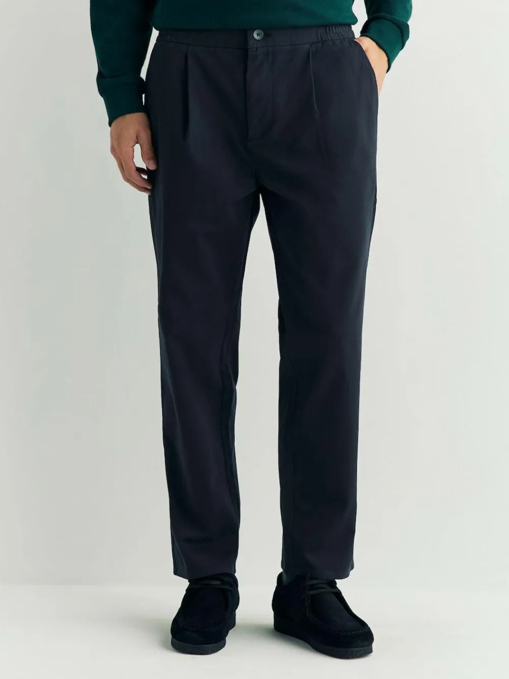 Upgrade your comfort and style with these versatile chinos trousers. Crafted from cotton-rich fabric with stretch, they offer exceptional ease of movement. The smart tapered leg cut, subtle pleat detail and comfortable elasticated waist make them perfect for effortless casual or relaxed smart wear. Elasticated Waist: These elasticated waist trousers are comfortable with a stretchy waistband, suitable for all occasions. They feature elastic integrated into the waistband, providing flexibility and a secure, non-restrictive feel. The primary benefit is all-day comfort due to the fabric’s stretch and flexibility. Cotton-rich fabric with stretch Pleat detail Tapered leg Machine washable. 98% Cotton, 2% Elastane.