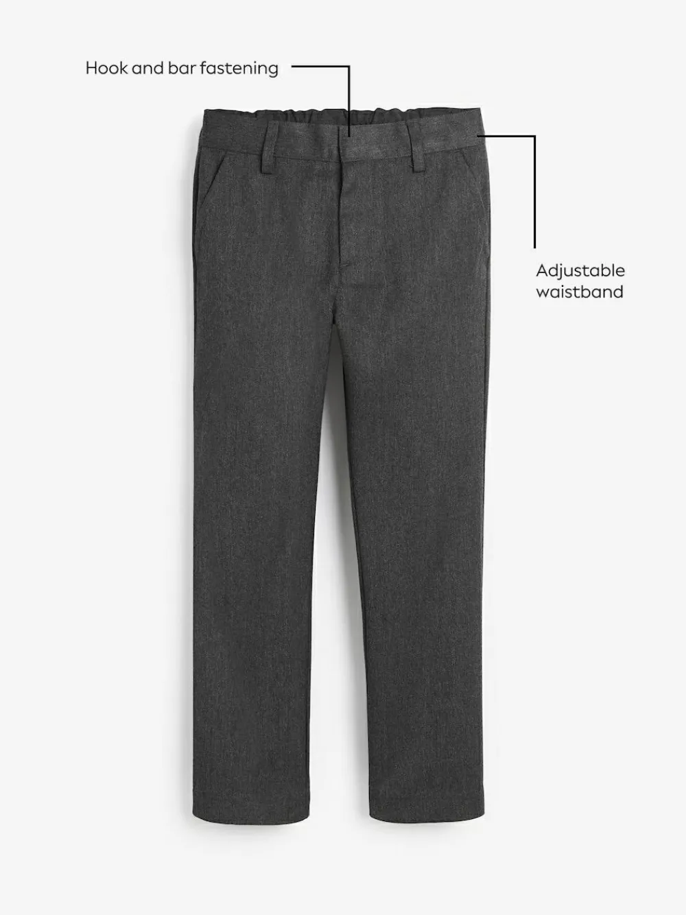 Go back to school in style with our formal straight trousers in grey. The adjustable waist and straight leg silhouette make these flat-front trousers a stylish addition to their school uniform. Made with an easy iron fabric and with a hook and bar fastening with zip fly. Key Features: Easy Iron fabric – Handy easy-iron finish Teflon® Technology – a treatment that repels water and water-based stains for easy cleaning and quick drying Machine washable Adjustable waist Flat front Straight leg style Machine washable. 65% Recycled polyester, 35% LENZING™ ECOVERO™ Viscose. This product is made with teflon. Teflon® is a registered trademark of DuPont.