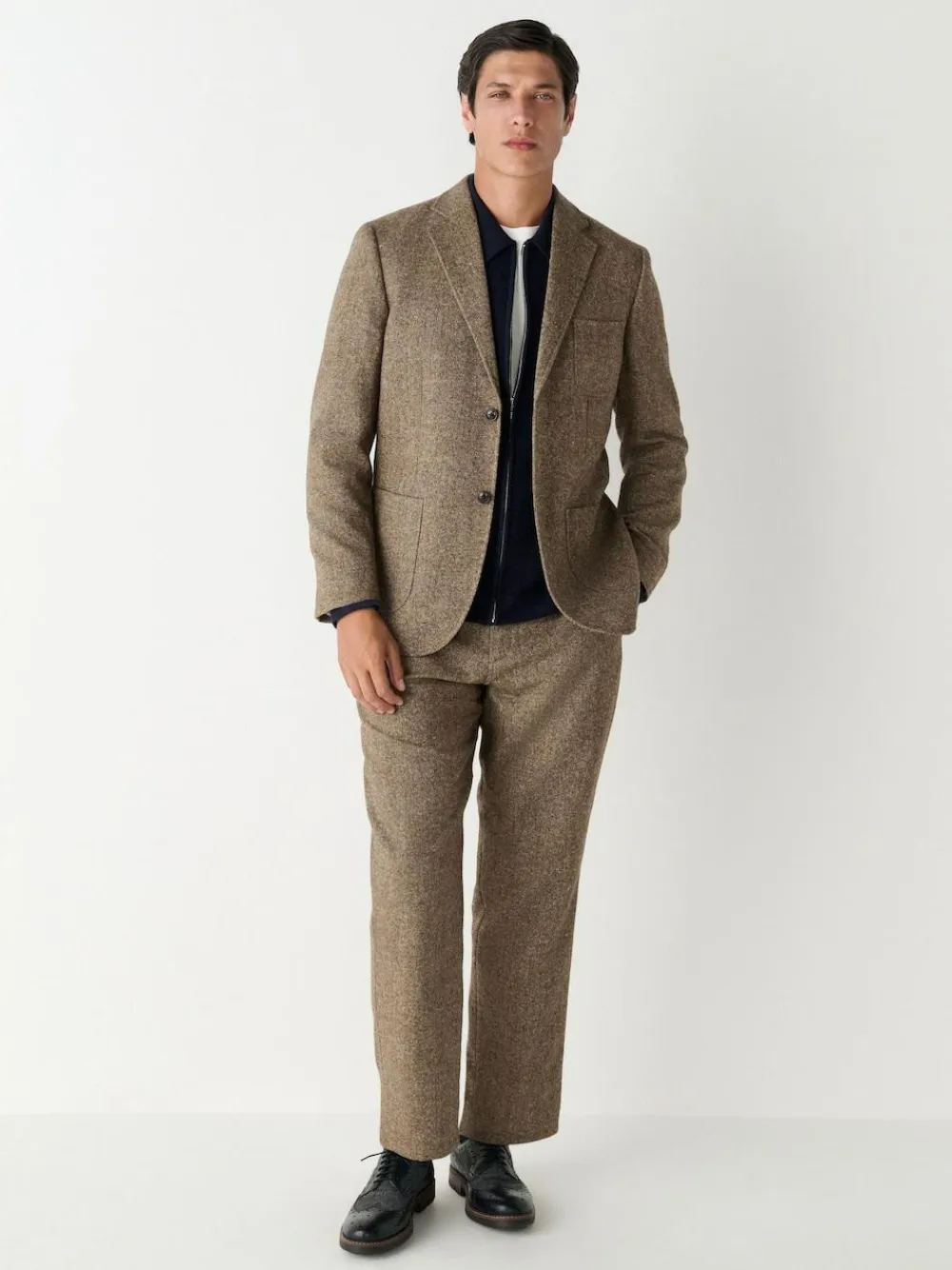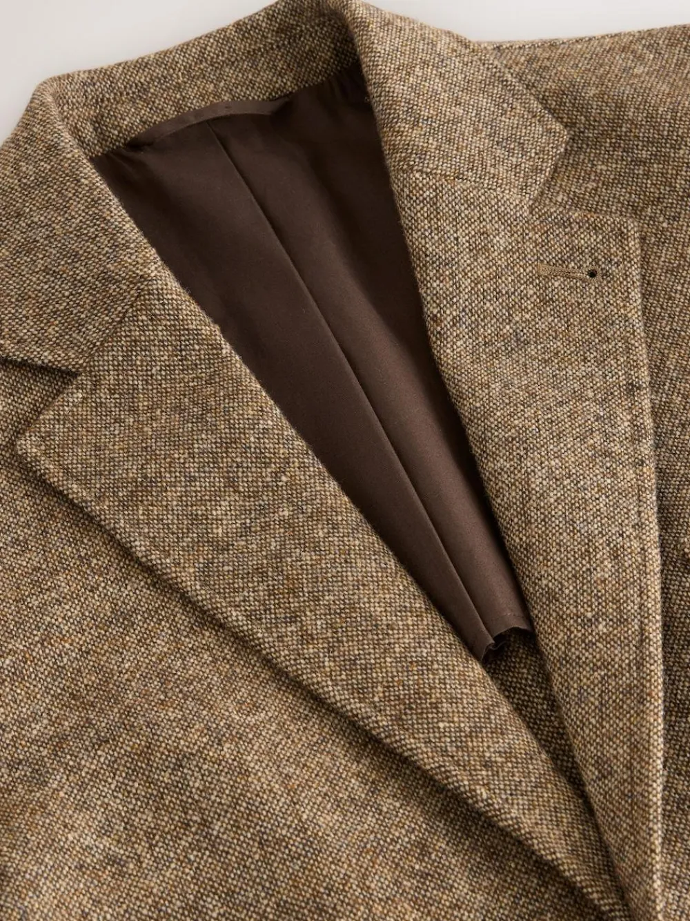 Add a touch of sophistication to your formal collection with this relaxed-fit, sand-coloured suit jacket. Crafted from a premium wool-blend Donegal fabric, it features a notch lapel and a smooth jacquard lining for a luxurious feel. Internal pockets add practicality, making it a perfect choice for smart-casual events. Wool blend Donegal fabric Relaxed fit Notch lapel Internal pockets Jacquard lining Two-button fastening Matching trousers available Main 49% Recycled wool, 46% Recycled polyester, 4% Acrylic, 1% Nylon. Lining 100% Cotton.