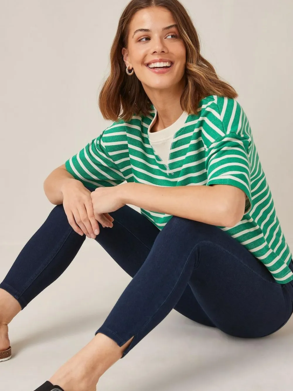 Our cropped jersey denim leggings in blue rinse are the perfect pairing to all your favourite tops and trainers. Made from a stretchy jersey denim blend, these mid-rise capri leggings are designed in a pull-on shape with a slim leg through to the calf. Ideal for when comfort is key, our jersey denim leggings are guaranteed to be your go-to for comfy, casual styling. Cropped style Stretchy jersey denim Pull-on Machine washable. 61% Cotton, 28% Recycled polyester, 11% Elastane. Items with the curve logo are available in sizes 18 and above., Our tall collection is designed to fit women 5’10” and above. This has been proportionally increased through the body, leg and sleeve to achieve the perfect fit. Available in sizes 8-20.