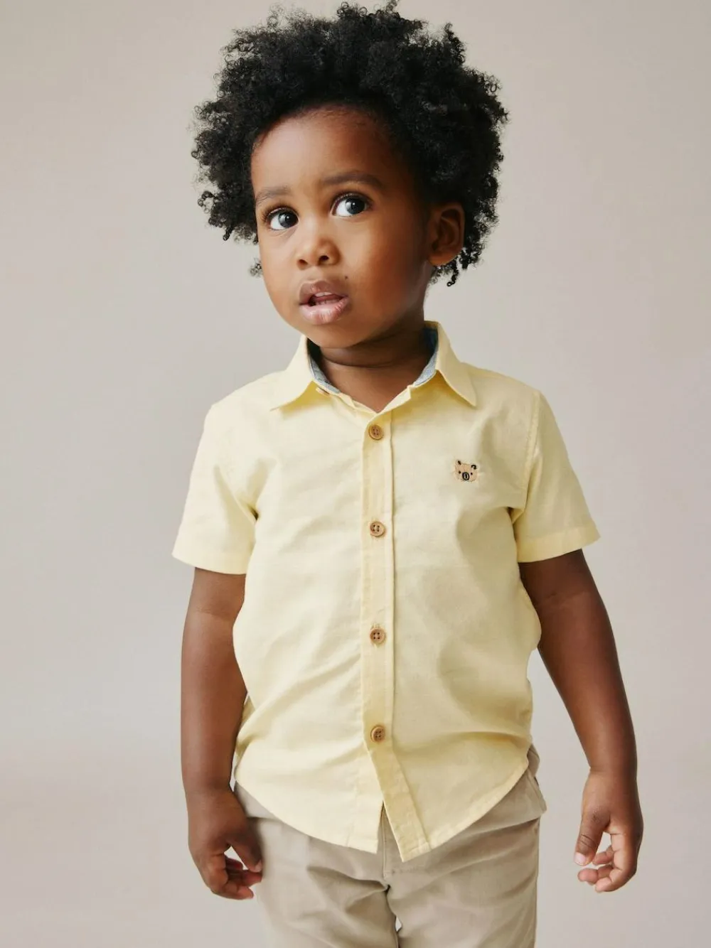 This cotton-rich Yellow shirt has an Oxford weave with short sleeves and a smart collar, perfect for casual wear or smart occasion outfits, finished with a button-up fastening. Cotton-rich Button-up fastening Collar detail Short sleeves Bear embroidery 98% Cotton, 2% Elastane.