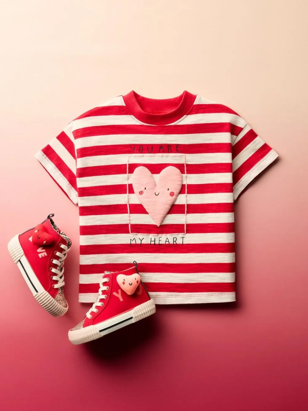 Bring some cheerful charm to her wardrobe with this red heart short-sleeved t-shirt. The playful heart graphic and bold stripe design add a fun, vibrant touch, making it a cute choice for everyday wear or a sweet Valentine’s themed outfit. The soft fabric ensures all-day comfort for her playtime adventures. Heart graphic Valentine’s themed Stripe print Short sleeves Crew neckline Machine washable. 100% Cotton.