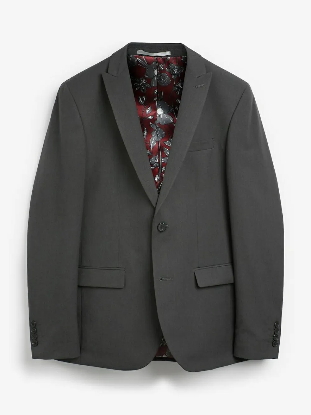 This stylish two button suit jacket in charcoal grey reflects our finesse for designing more affordable tailoring. Crafted in a machine washable fabric, it’s detailed with everything you could expect from a classic suit, including twin back vents, a peaked lapel and neat flap pockets. Complete the look with matching suit trousers for a versatile, smart look that will see you through the seasons. Suit lining may differ from imagery. Two button suit jacket Skinny fit Peaked lapel Twin back vents Flap pockets Satin lining Machine washable Machine washable. Main 62% Recycled polyester, 35% Viscose, 3% Polyester. Lining 100% Polyester. To view our Men’s Suit Fit Guide CLICK HERE Indicates styles available in Tall sizes with longer sleeves & body