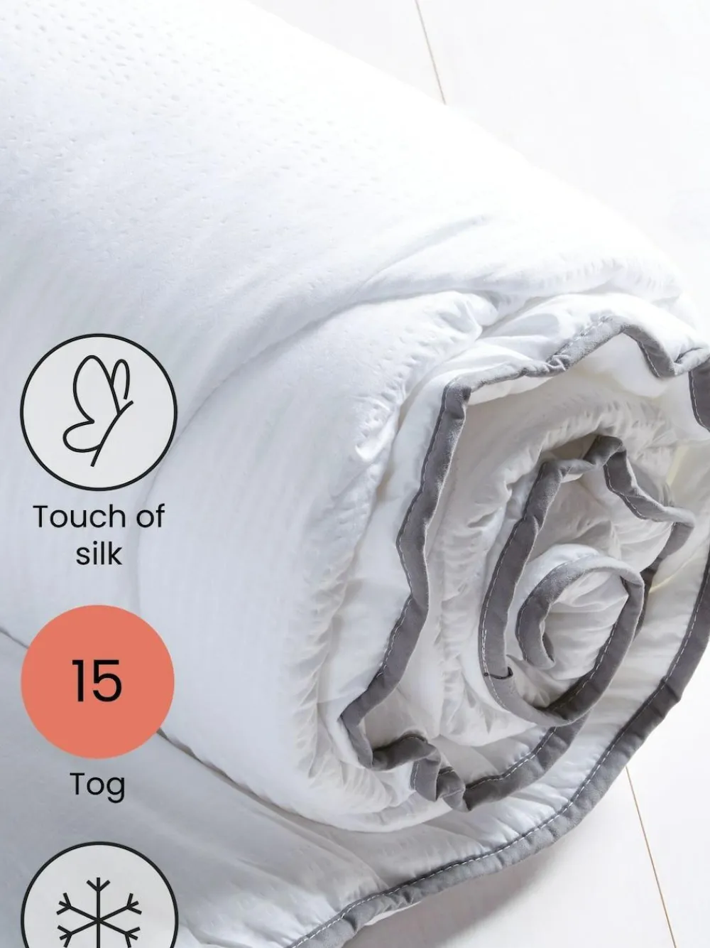 Sleep In Silk Range Immerse yourself in sleep with our touch of silk duvet, offering the ideal mix of comfort with a lightweight feel. With a hint of natural silk blended in, this duvet is as soft as a cloud, and its seersucker detail adds an extra point of interest to your bedding. Available in a range of togs to suit your needs. Key Features: 15 Tog Duvet Silk Feel Product Dimensions: Single: 135 x 200cm Double: 200 x 200cm King: 230 x 220cm Superking: 260 x 220cm Tog ratings: 3 Tog: Suitable for warm summer nights 4.5 Tog: Suitable for summer nights 7.5 Tog: Suitable for spring & summer 10.5 Tog: Suitable for all year round 13.5 Tog: Suitable for cold winter nights 15 Tog: Suitable for cold winter nights For top tips on choosing the best duvets and pillows for you read our handy guide here. Machine washable. Cover 100% Recycled polyester. Filling 95% Recycled polyester, 5% Silk.