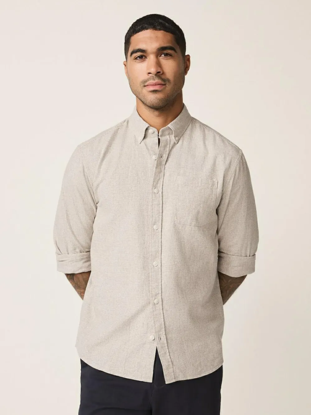 Achieve effortless warm-weather style with this Cotton Linen Blend Long-Sleeve Shirt. Crafted from a breathable cotton-linen blend with a subtle textured fabric, it’s designed to keep you cool and comfortable. The smart button-down collar, neat button-up fastening, and classic regular-fit make it an ideal, versatile piece for smart-casual summer-wear. Available in standard sizes. Breathable cotton-linen blend fabric Subtle textured finish Smart button-down collar Comfortable regular-fit Long sleeve design Available in standard sizes Best for smart-casual summer-wear Machine washable. 70% Cotton, 30% Linen.