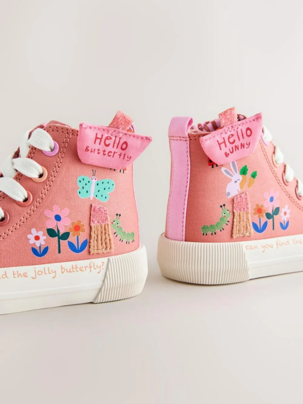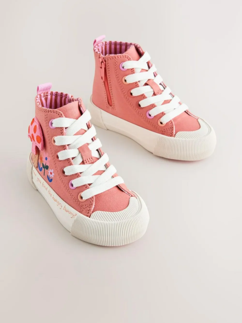 Introduce a fun, unique style to the footwear collection with these Coral Pink Interactive Standard Fit (F) High Top Trainers. The trainers boast 3D interactive detail / storybook design elements, perfect for Everyday / Nursery wear. For easy dressing, they feature an inside zip for easy fitting, and a reliable slip resistant durable sole for confident steps. 3D interactive detail / storybook design Everyday Nursery Slip resistant durable sole Inside zip for easy fitting Upper – Textile, Lining & Sock – Textile, Sole – Other Materials.