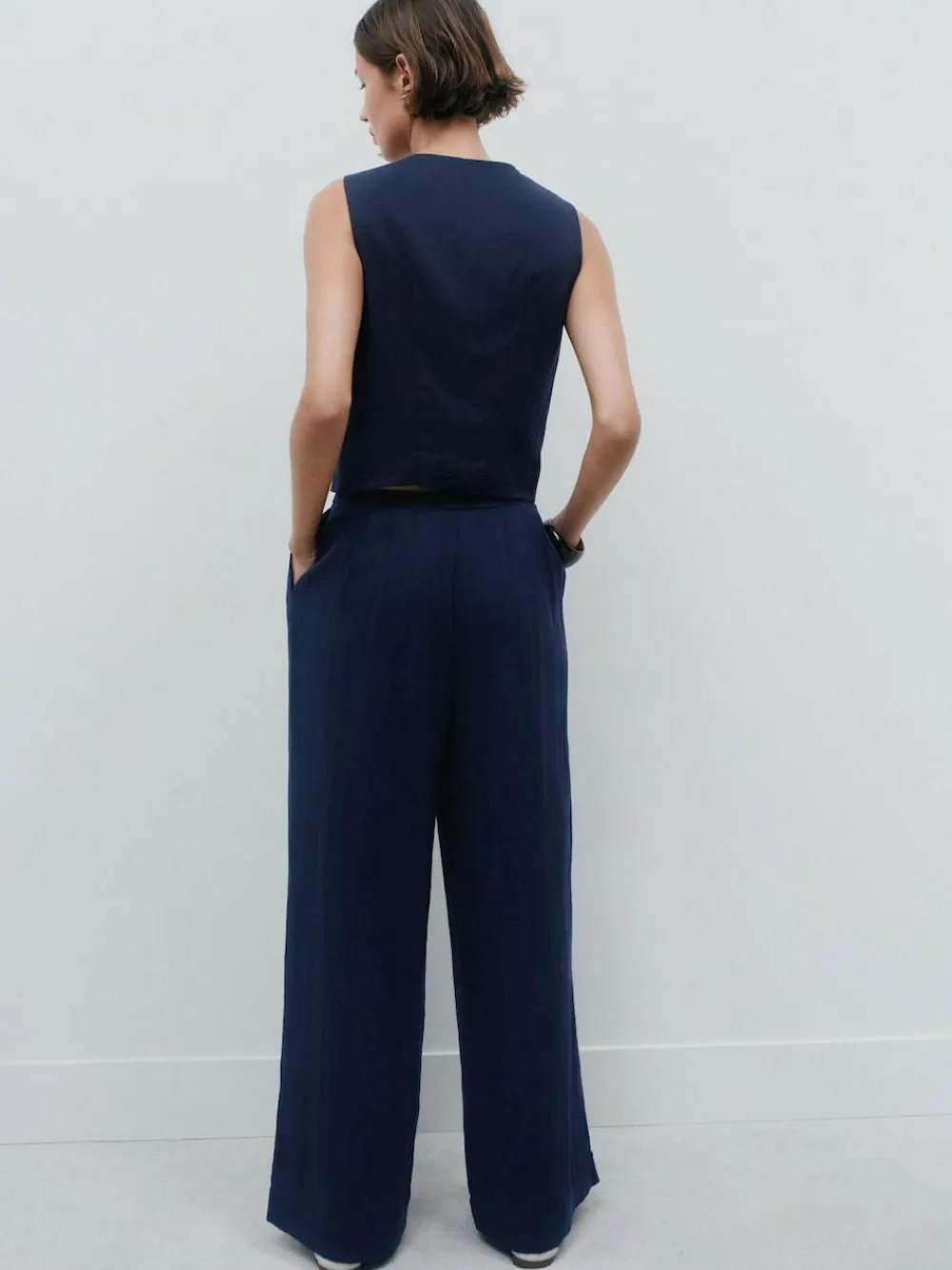 Flow through your day in these gorgeous superwide pleated navy trousers. Crafted from a fluid, soft fabric, they offer dramatic movement and sophisticated drape. Key features include a tailored waist with three eye-catching buttons, smart pleating, and a comfortable zip and fly fastening. Perfect for creating a stylish, elongated silhouette. Fluid soft fabric Elegant front pleats Superwide leg silhouette Zip and fly fastening Side pockets Short to fit inside leg 27″ / 69cm. Regular to fit inside leg 29″ / 74cm. Long to fit inside leg 31″ / 79cm. XL Tall to fit inside leg 33″ / 84cm. Machine washable. 64% TENCEL™ lyocell, 30% LENZING™ ECOVERO™ Viscose, 6% Viscose. Items with the curve logo are available in sizes 18 and above., Our tall collection is designed to fit women 5’10” and above. This has been proportionally increased through the body, leg and sleeve to achieve the perfect fit. Available in sizes 8-20.