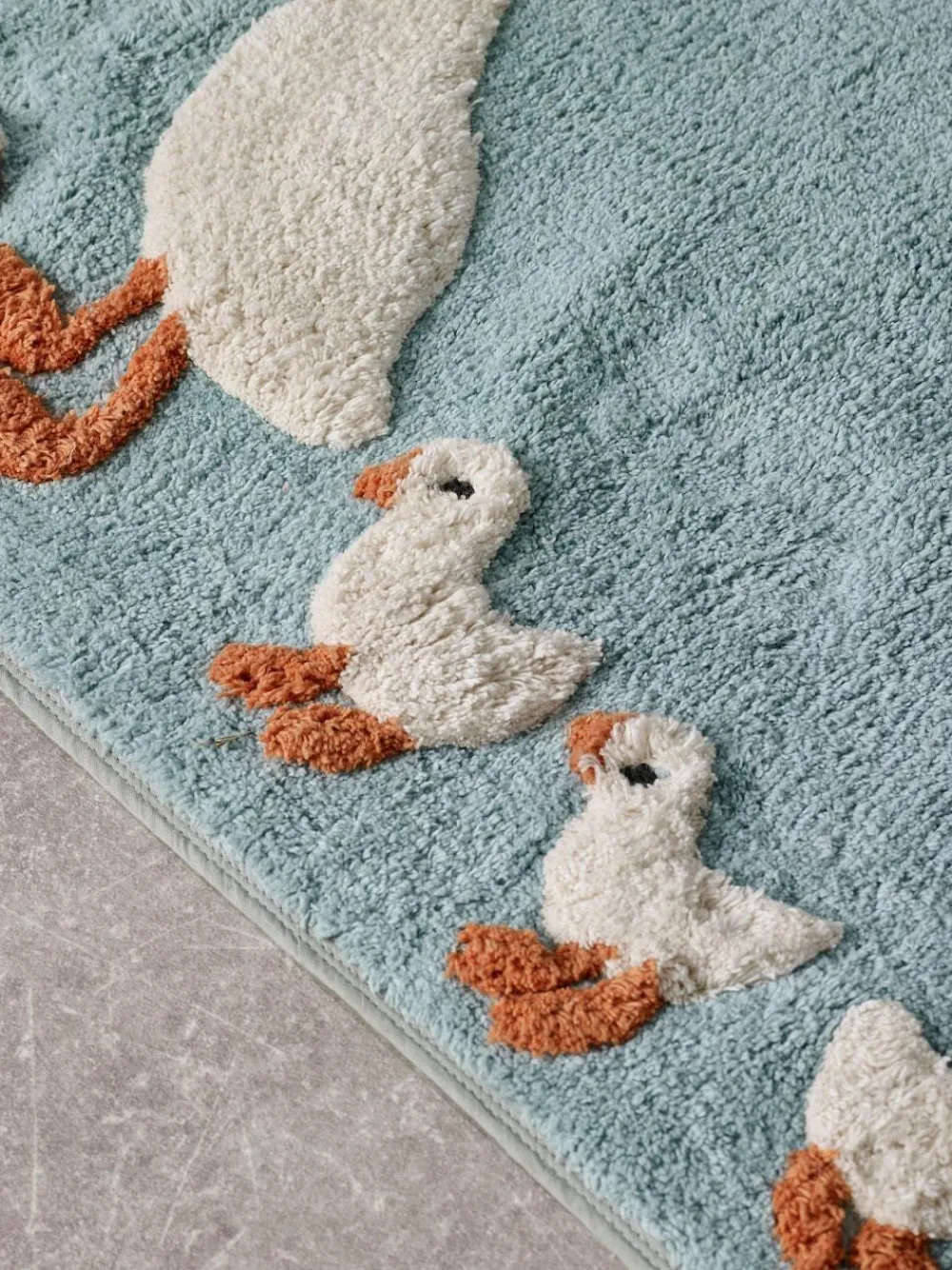 Brighten up your bathroom with this adorable Goose and friends runner bath mat. Its charming design will add a touch of character to your space, while also providing comfort and safety with its non-slip surface. Length 45cm Width 110cm Machine washable. 100% Cotton.