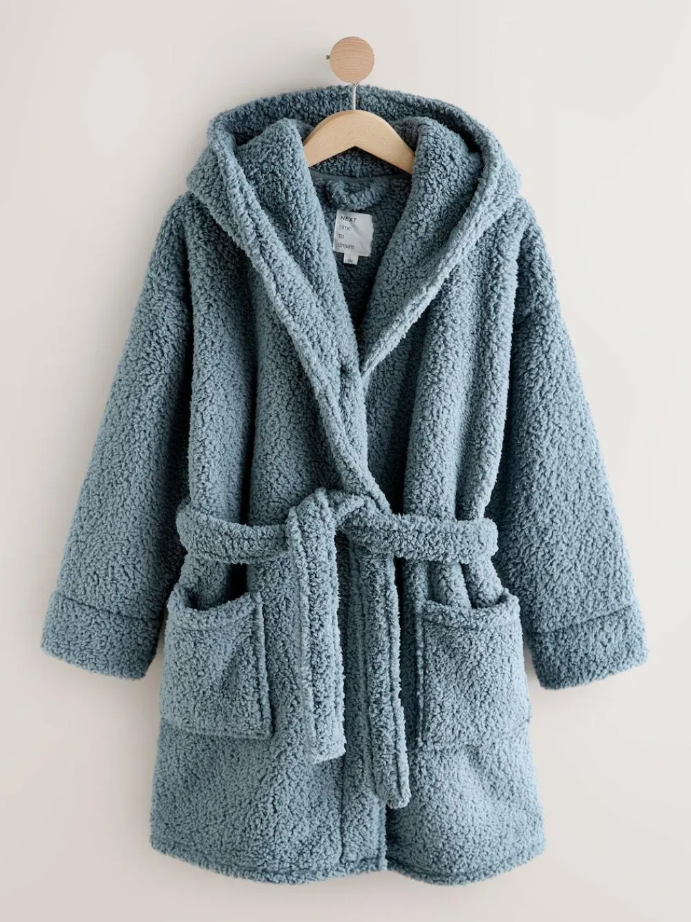 Wrap up in cosy luxury with this blue hooded dressing gown. The plush, textured fabric is soft and incredibly warm. It features a secure tie waist and two front pockets, offering a snug and comfortable finish. Hooded Tie waist Available in multiple colours Available in longer length 100% Recycled polyester. Warning: Keep away from fire and flames.